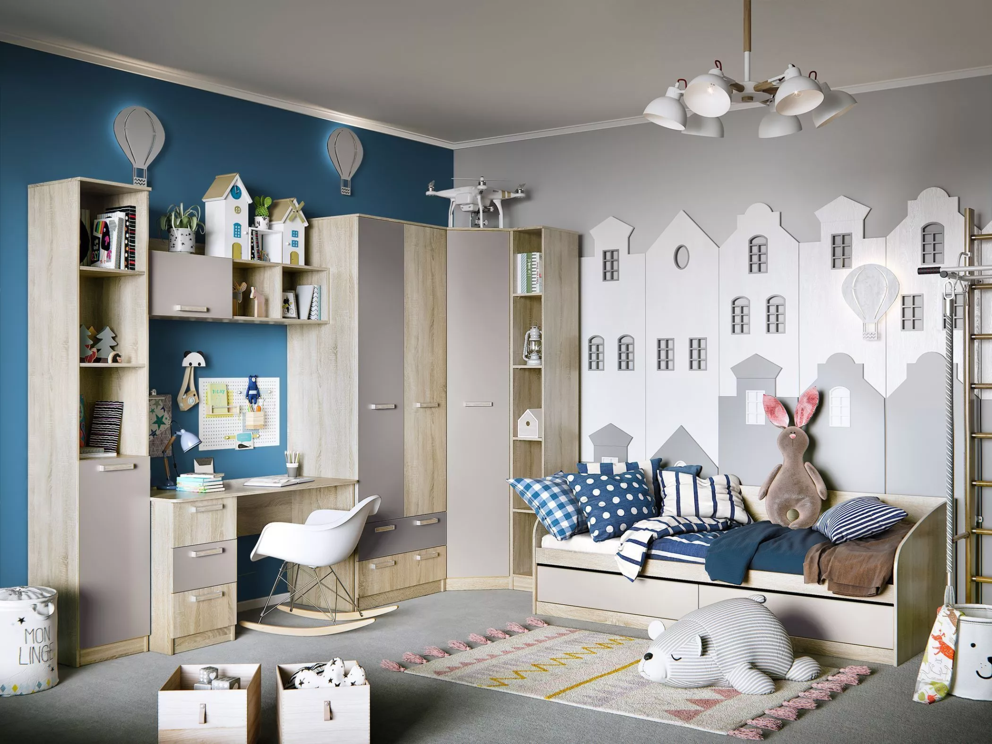 Комплектация №1 из коллекции АКВАРЕЛЬ поможет организовать в детской идеальный рабочий уголок. Благодаря тому, что над письменным столом находится полка, а рядом с ним расположен шкаф, учебные принадлежности ребенка будут сразу под рукой. С комплектацией №1 станет возможной и организация практичной системы хранения в детской. Два вместительных шкафа помогут отделить домашнюю одежду от школьной. Шкаф для книг ребенок сможет использовать в качестве места хранения учебников, а стеллаж станет отличным решением для размещения домашней библиотеки. Комплектация №1 – залог идеального порядка в детской.Цвет корпуса/фасада