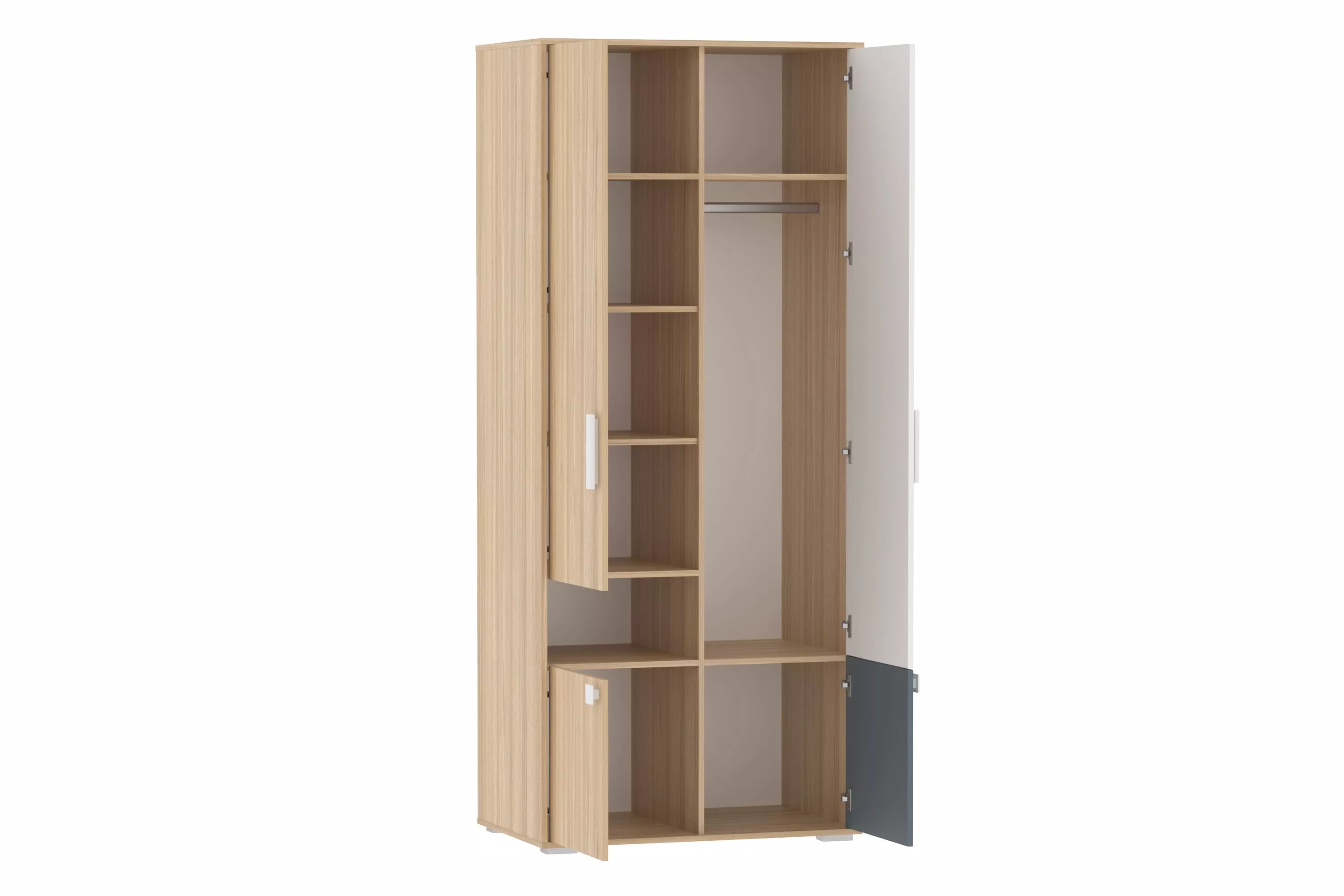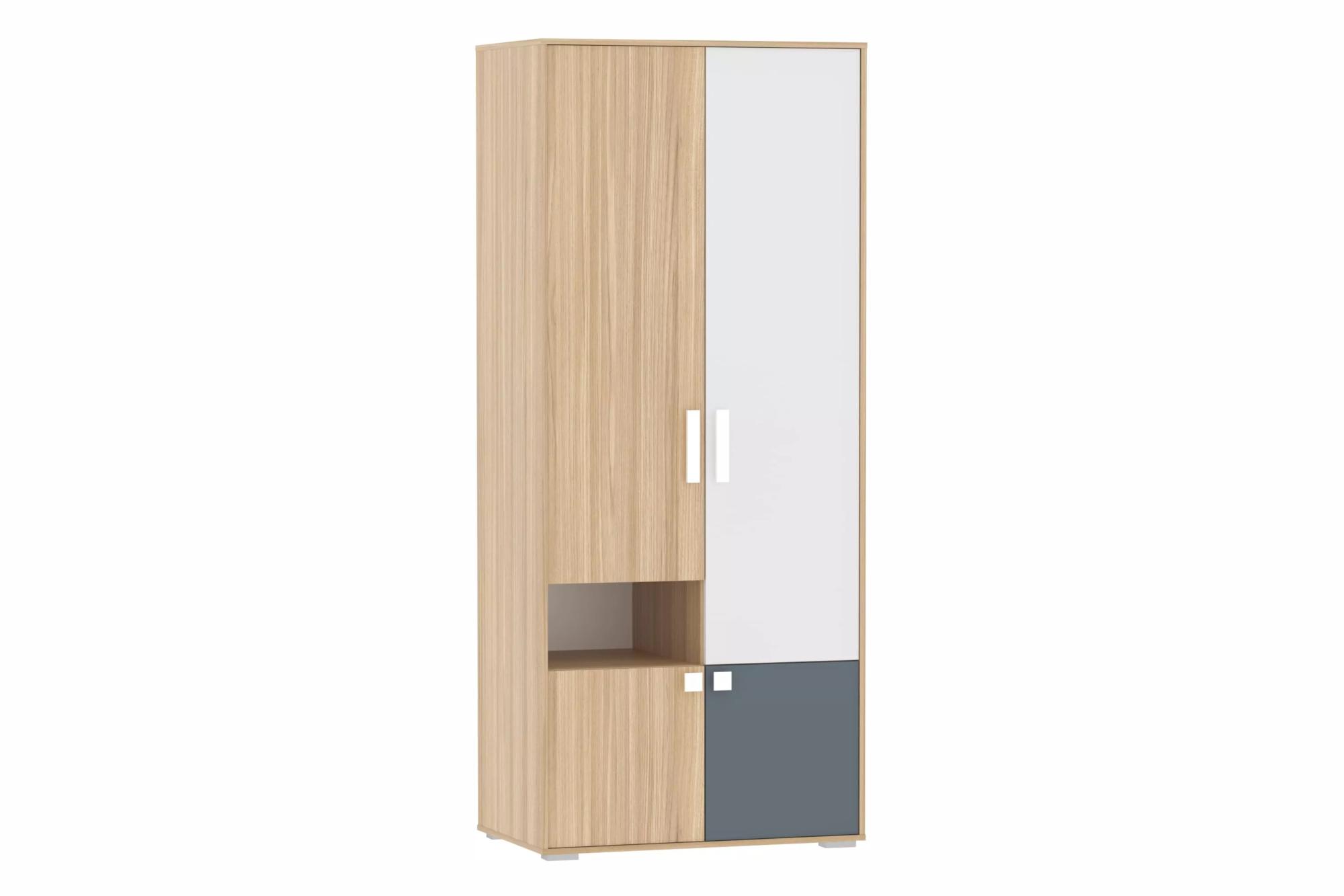 Шкаф для одежды из новой коллекции детской мебели «Элиот» выполнен в нейтральных оттенках: песочном, белом и контрастном маренго — цвете тёмной морской волны. Эти оттенки отлично подойдут как для комнаты девочки, так и для комнаты мальчика, делая её стильной и современной.Шкаф оснащён четырьмя распашными дверями и множеством полок, обеспечивающих достаточно места для хранения вещей. Внутри шкафа предусмотрена овальная штанга для одежды на вешалках. Комбинируйте шкаф для одежды с одноимёнными модульными шкафами-пеналами или стеллажами, чтобы создать систему хранения на любой вкус и размер!