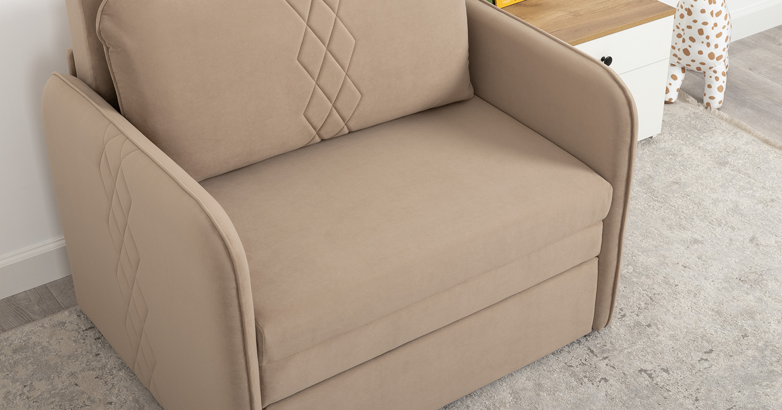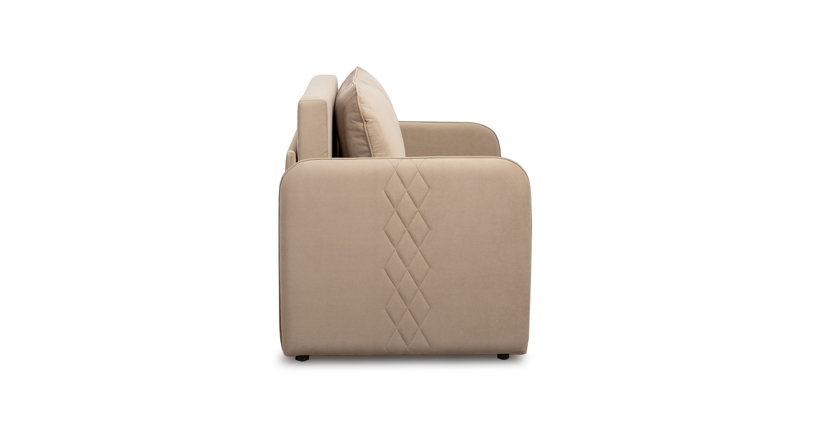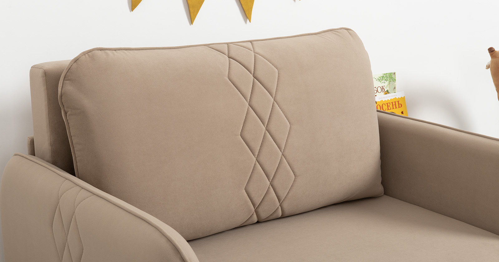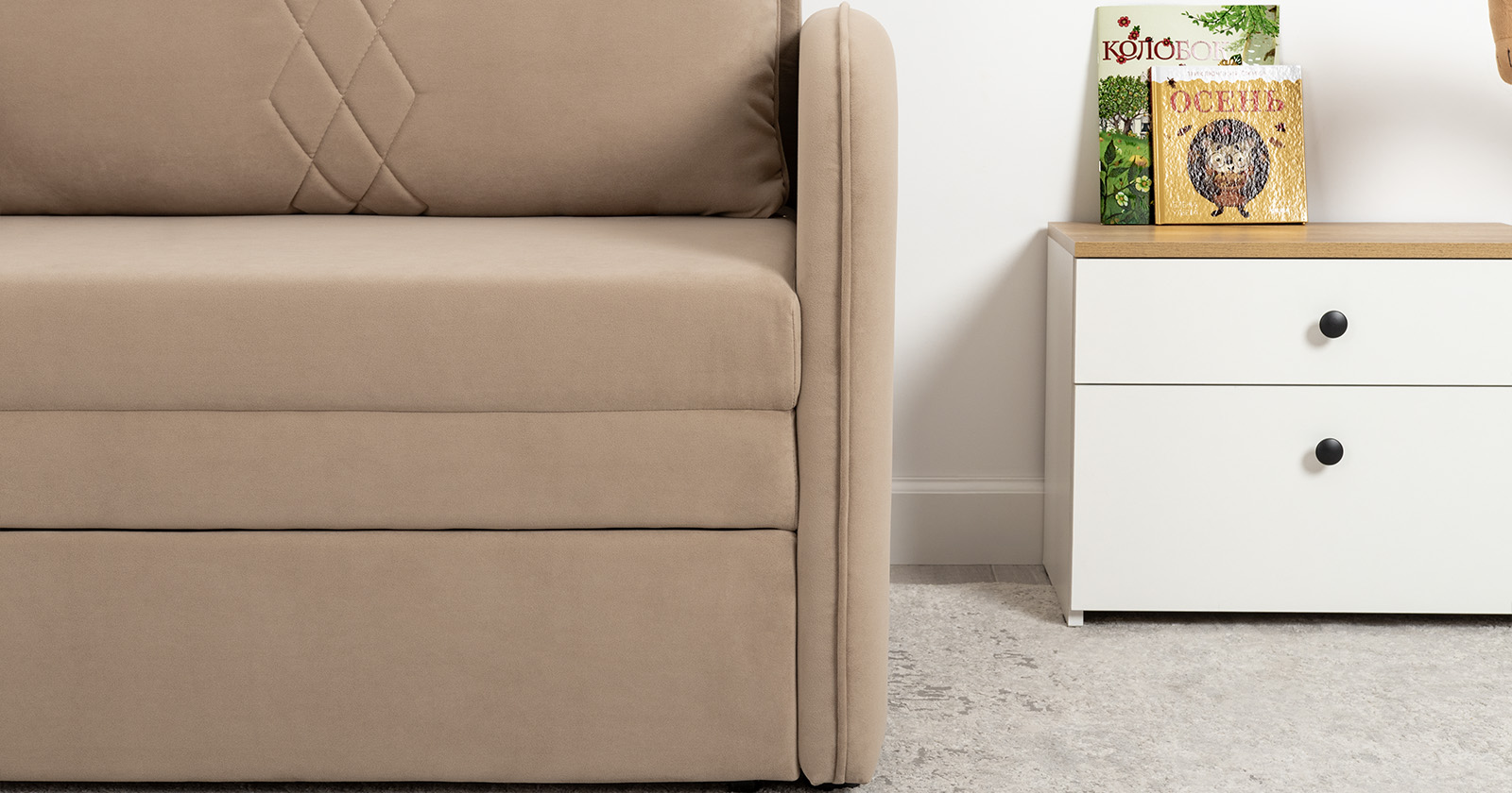 Стильный компактный диван для детской и гостиной. При своих скромных размерах он трансформируется в полноценное спальное место для детей и подростков. Лаконичный дизайн в виде декоративной стежки подчеркивает фактуру велюра, а небольшие размеры позволят разместить его в любом пространстве.Габариты: