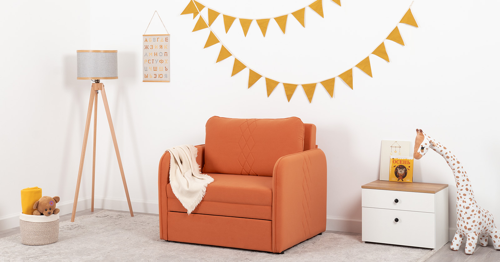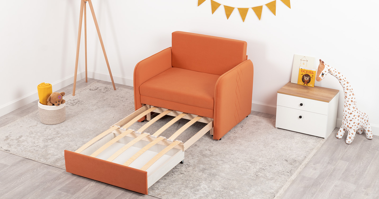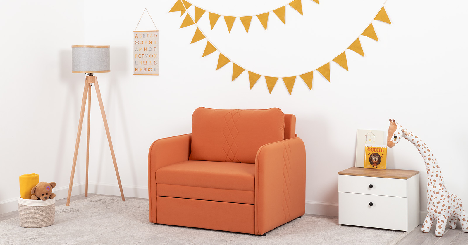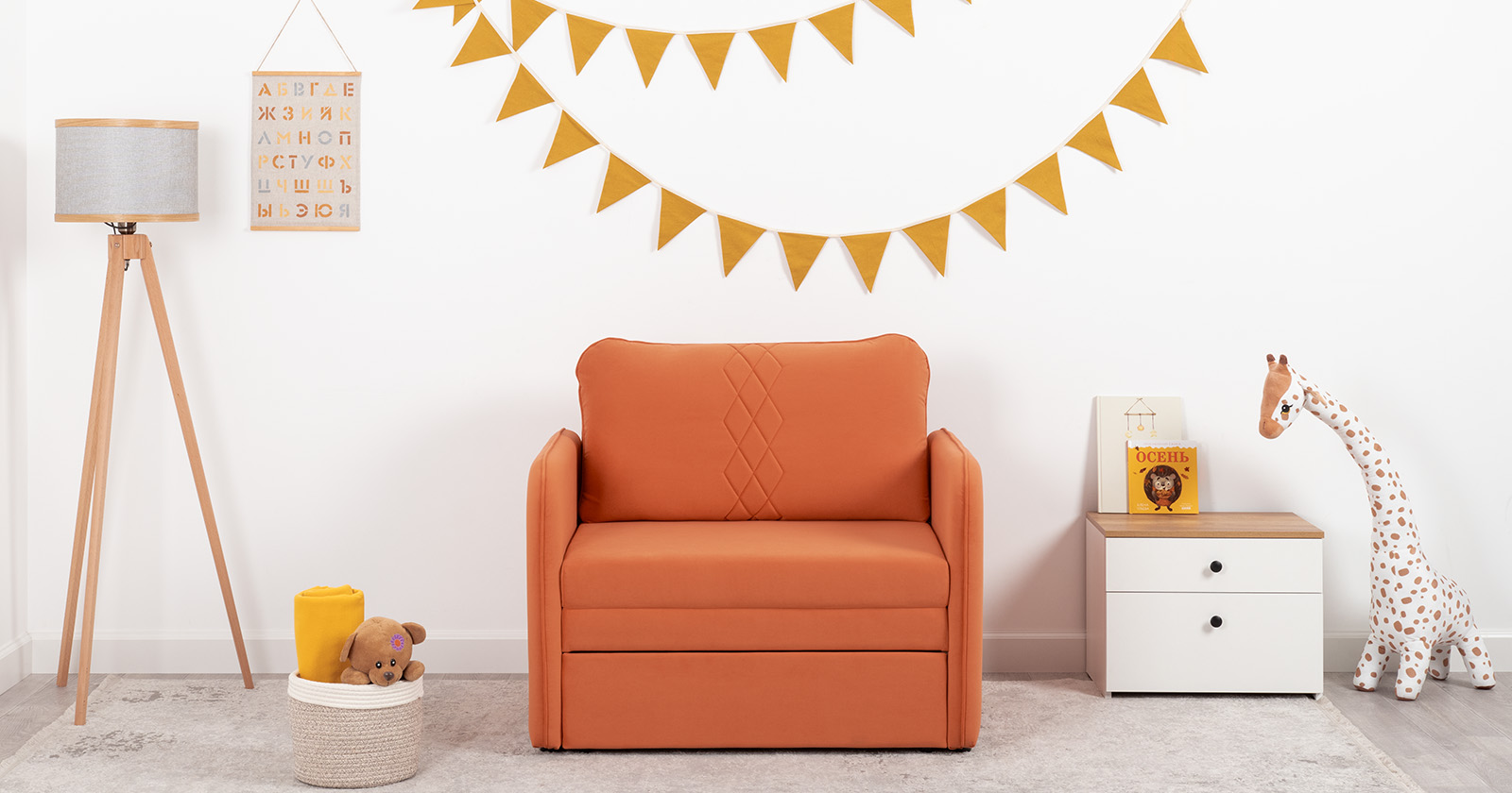 Стильный компактный диван для детской и гостиной. При своих скромных размерах он трансформируется в полноценное спальное место для детей и подростков. Лаконичный дизайн в виде декоративной стежки подчеркивает фактуру велюра, а небольшие размеры позволят разместить его в любом пространстве.Габариты: