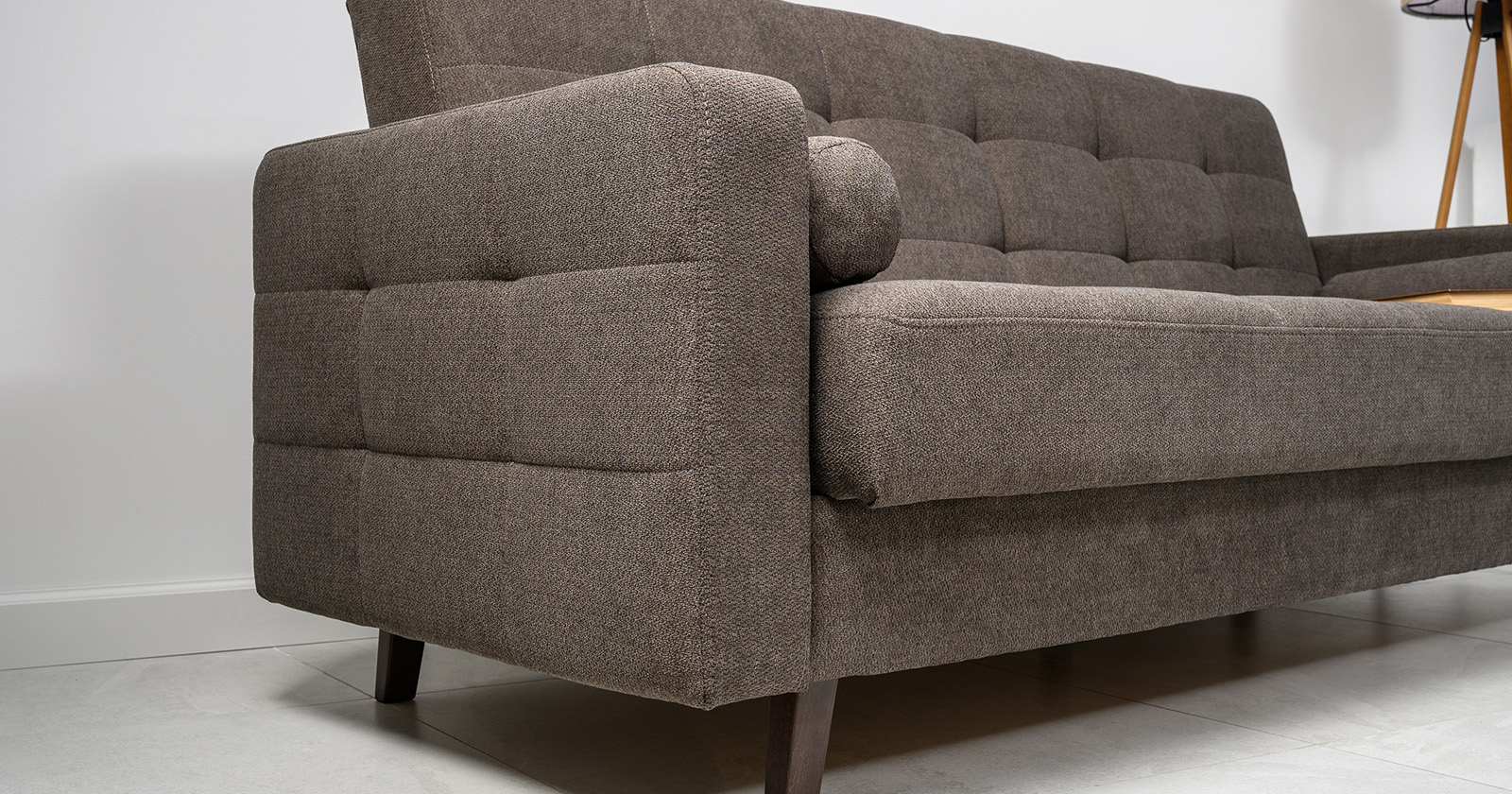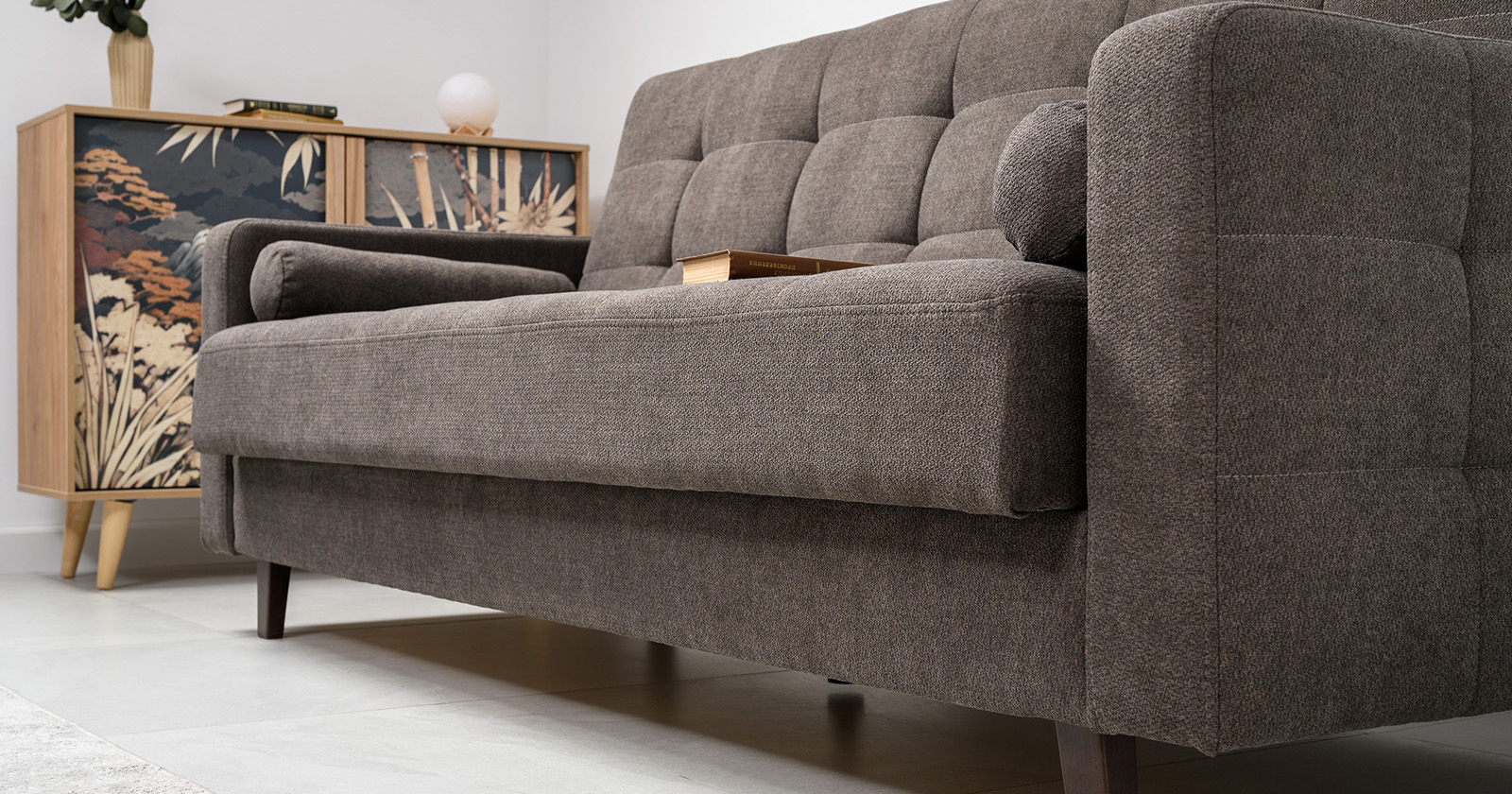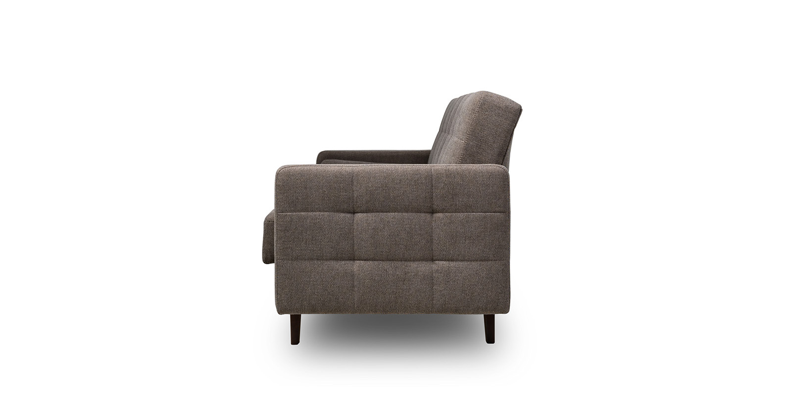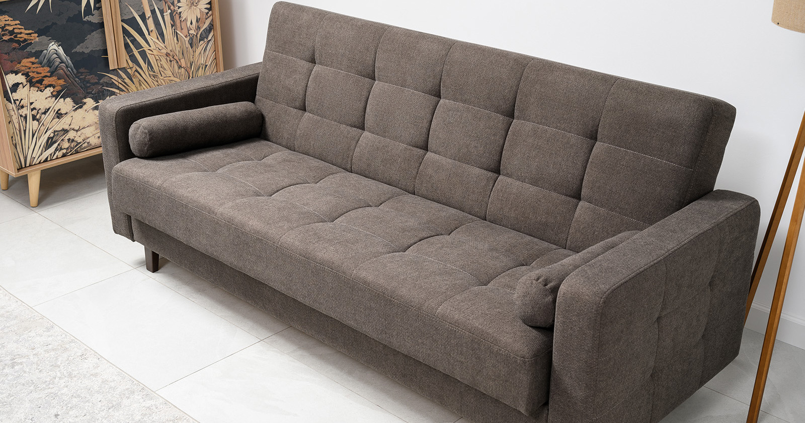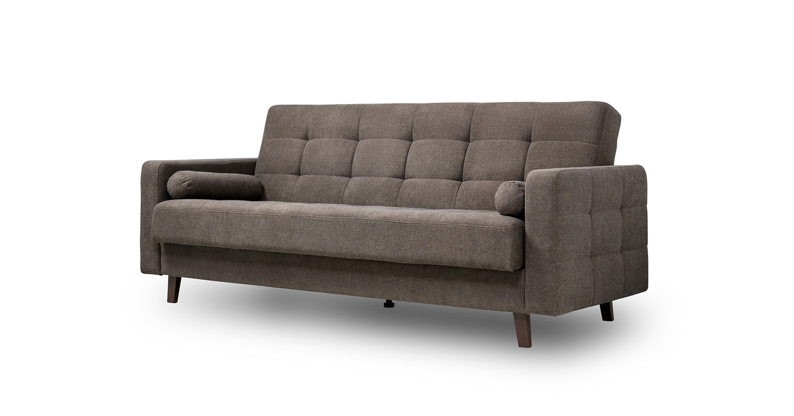 Прямоугольная стежка по спинке, посадочному месту и подлокотниках, круглые подушки-валики