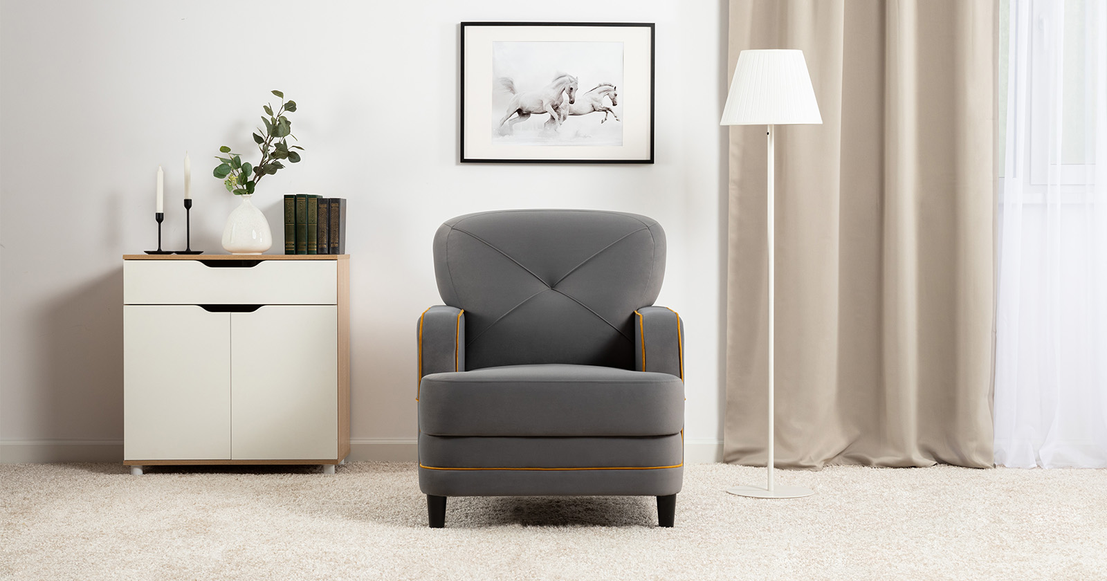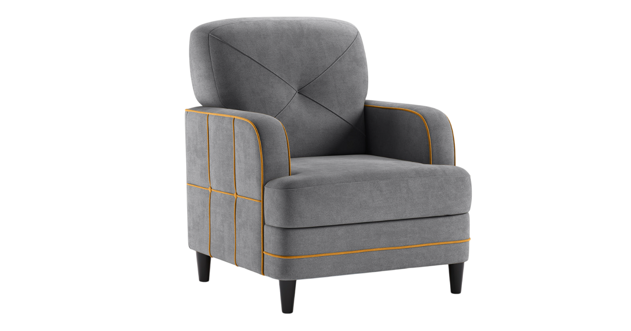 Декоративные канты на вставке подлокотников. Пуговицы в местах пересечения кантов на подушке и вставке подлокотников. По торцам подлокотников и думках контрастный декоративный кант. Защипы на сиденье и подушке.