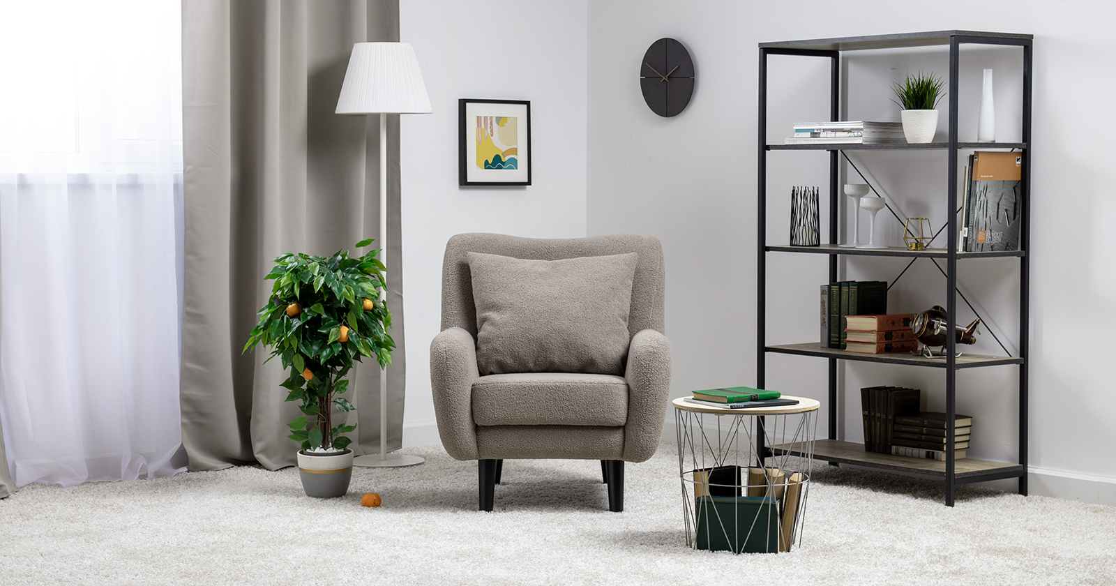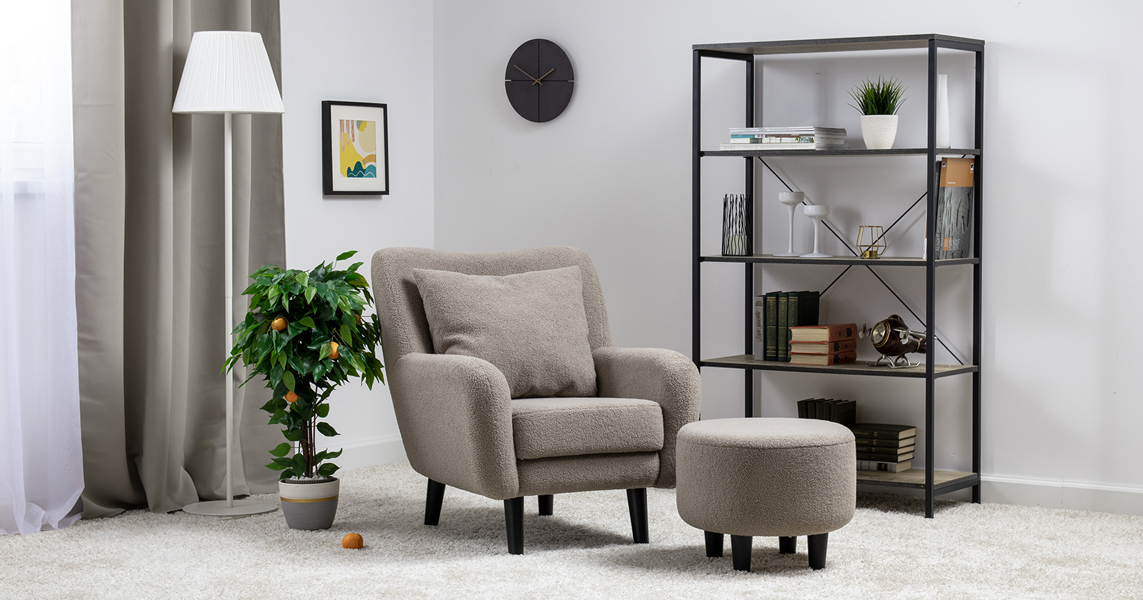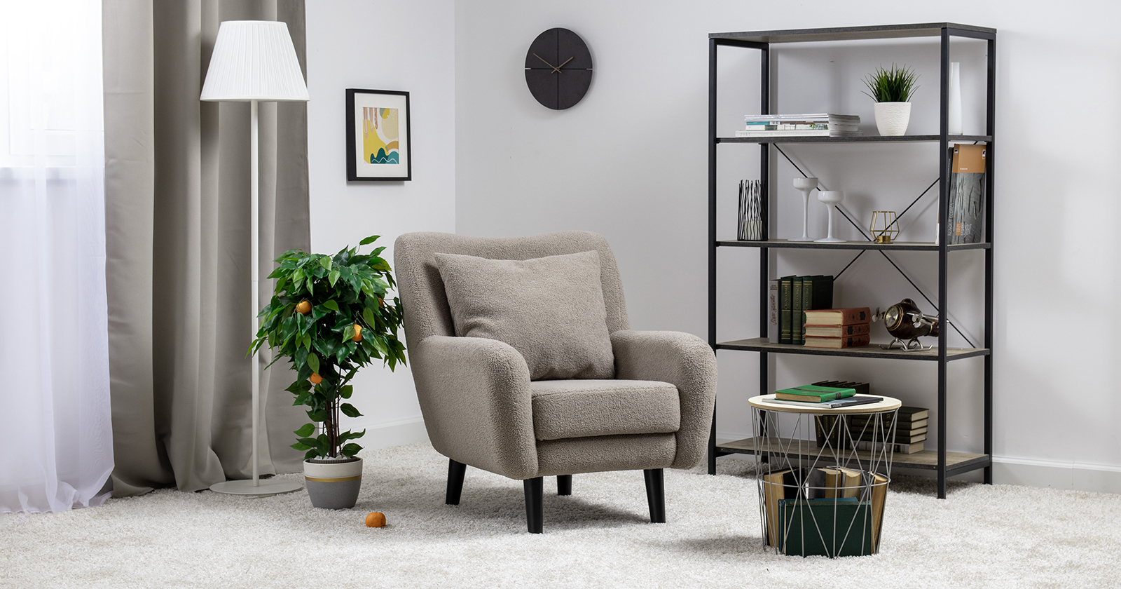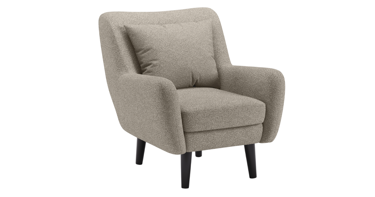 Ткань букле делает кресло особенно уютным и мягким. Приспинная подушка в цвете кресла
