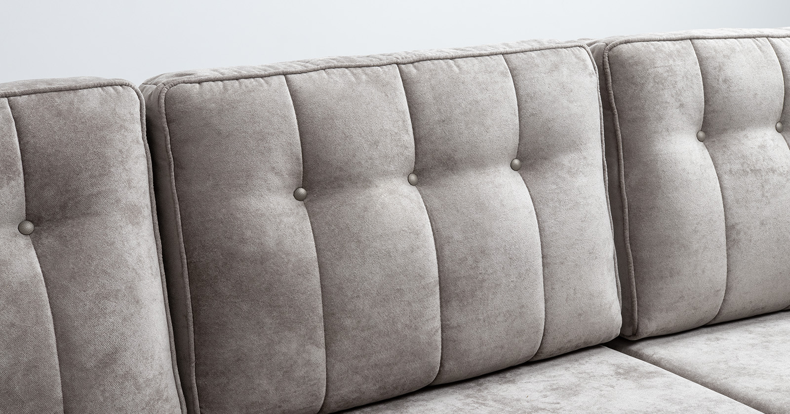 Подушки имеют трапециевидную форму, с утолщением к низу для комфорта посадки. Кант по всему периметру подушек, декоративные утяжки металлическими пуговицами, вертикальная стежка