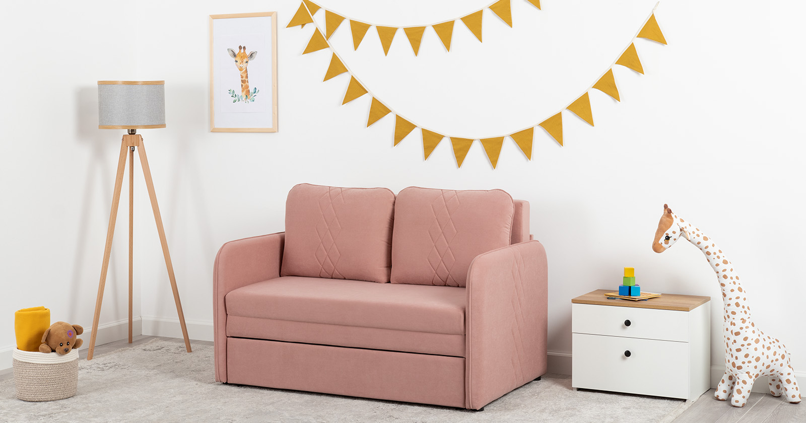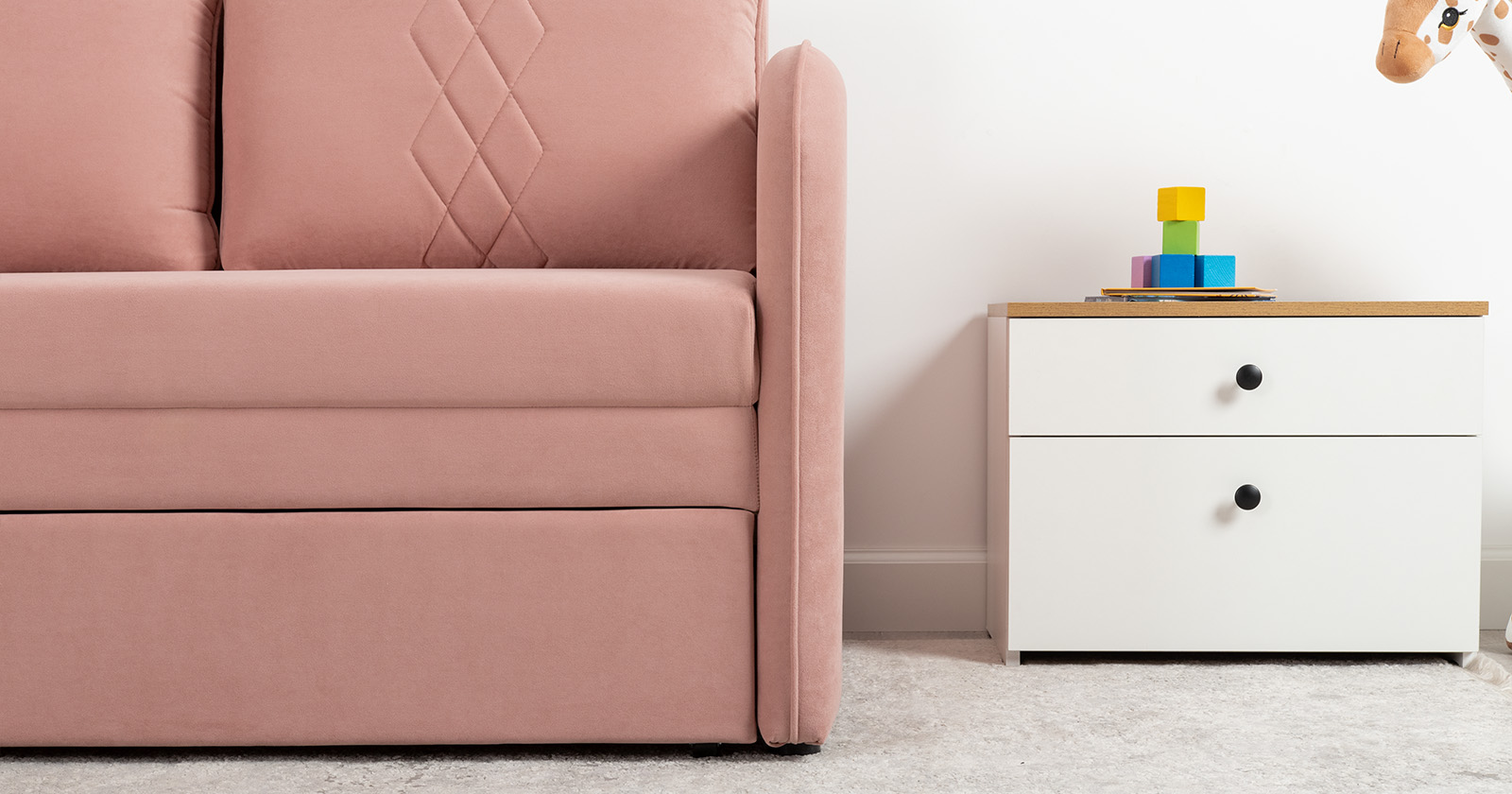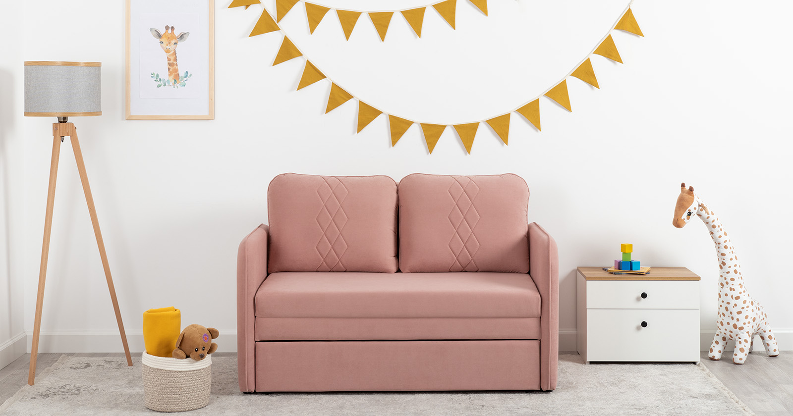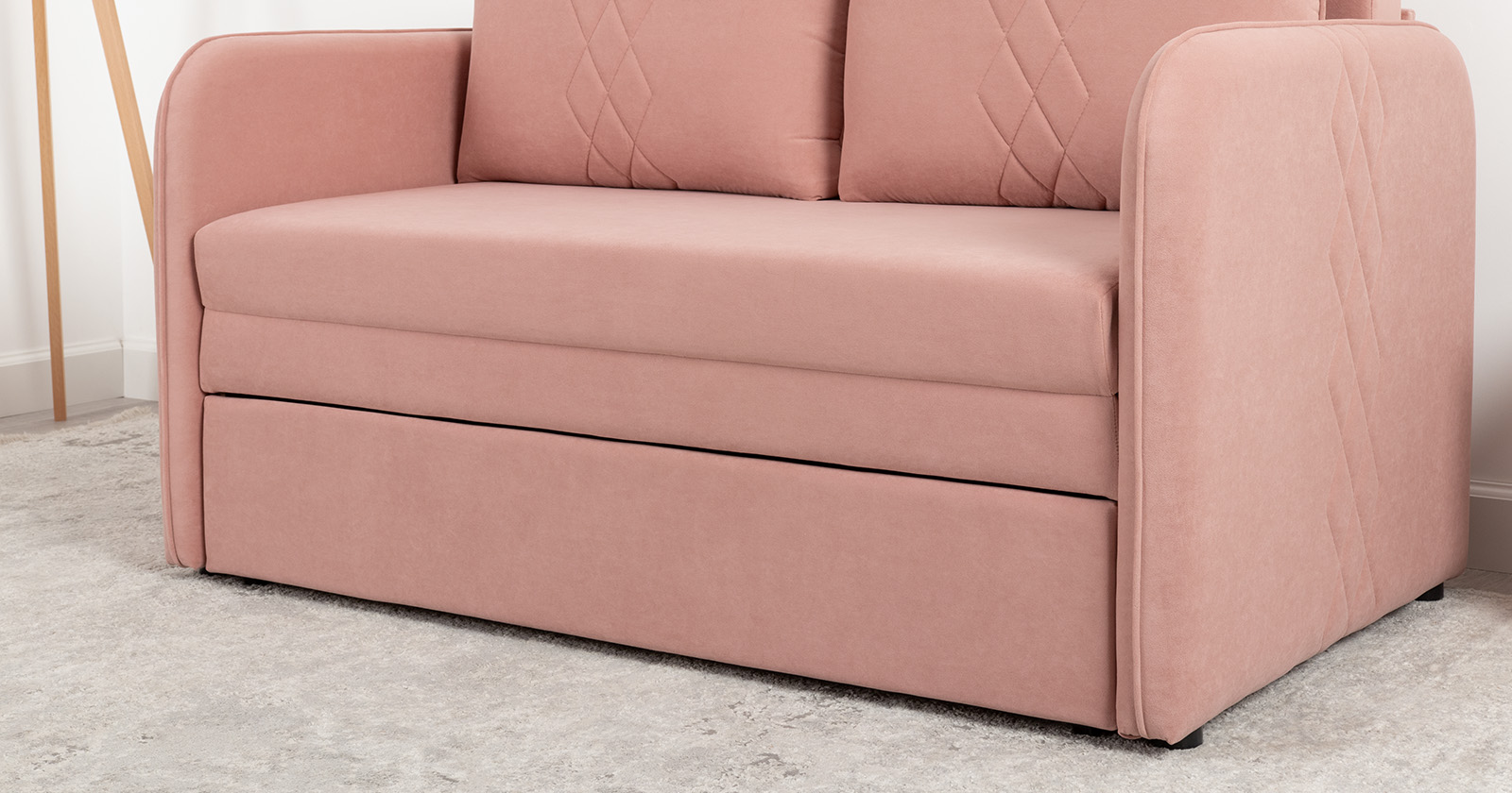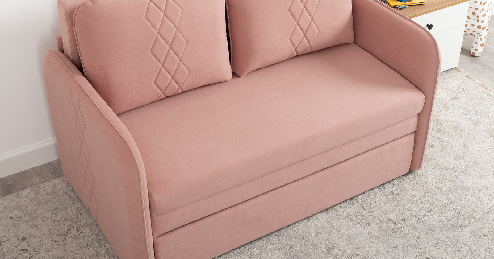 Стильный компактный диван для детской и гостиной. При своих скромных размерах он трансформируется в полноценное спальное место для детей и подростков. Лаконичный дизайн в виде декоративной стежки подчеркивает фактуру велюра, а небольшие размеры позволят разместить его в любом пространстве.Габариты: