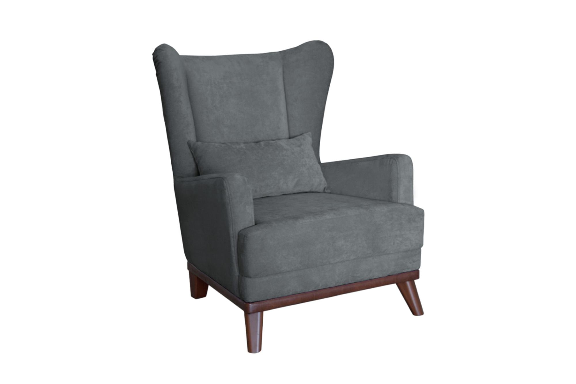 Высокая спинка с наклоном и мягкие подлокотники обеспечивают удобную посадку, дополнительный комфорт создает декоративная подушка. Царга кресла обтянута искусственной кожей в цвет опорам.Габариты: