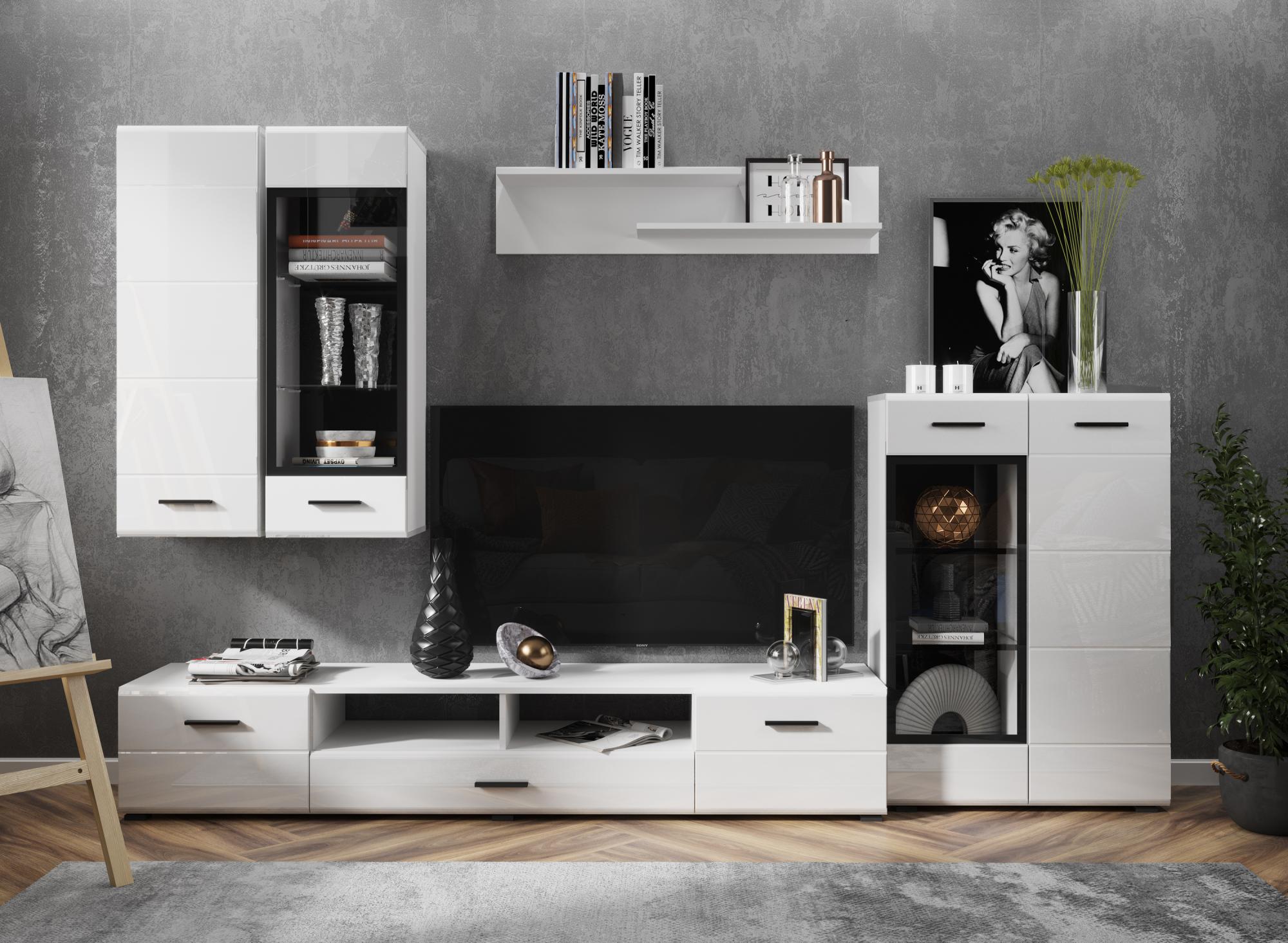 Глосс идеально подходит для интерьера гостиной в стиле хай-тек. Сочетание открытых и закрытых секций для хранения позволит найти оптимальное место для любой вещи. На широкую поверхность можно установить телевизор большой диагонали, игровую консоль или другую сопутствующую технику.Состав комплектации №1: