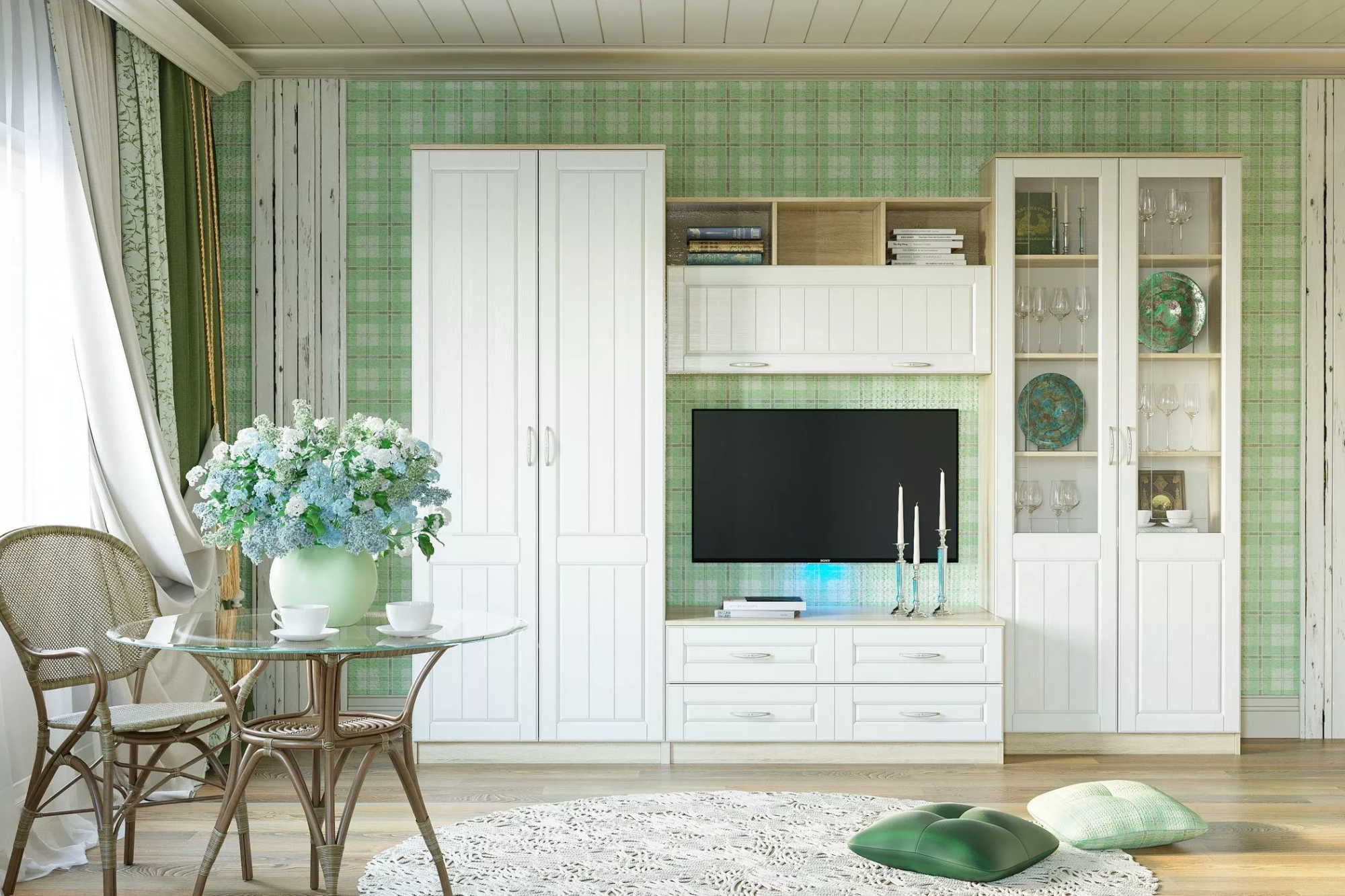 Коллекция ОЛИВИЯ – это воплощение легкости и нежности. Отличительной чертой комплектации №1 является симметричность. Модули одинаковых форм и размеров расположены рядом друг с другом, образуя тем самым нишу под ТВ. Сочетание шкафа-витрины и шкафа для одежды позволит максимально функционально использовать пространство гостиной. Просто разместите за стеклянными дверцами те вещи, которыми хотите похвастаться, а предметы гардероба, документы и ценные вещи спрячьте за глухими фасадами.