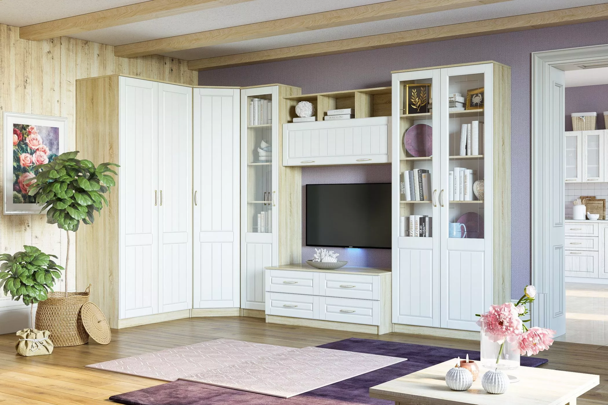 Коллекция ОЛИВИЯ – это воплощение легкости и нежности. Если в гостиной много места, то комплектация №3 – это идеальный вариант. Модули расположены рядом друг с другом, образуя тем самым нишу под ТВ. Сочетание шкафов-витрин и шкафа для одежды позволит максимально функционально использовать пространство гостиной. И для одежды, и для книг, и для сувениров найдется свое место. Просто разместите за стеклянными дверцами те вещи, которыми хотите похвастаться, а предметы гардероба, документы и ценные вещи спрячьте за глухими фасадами.