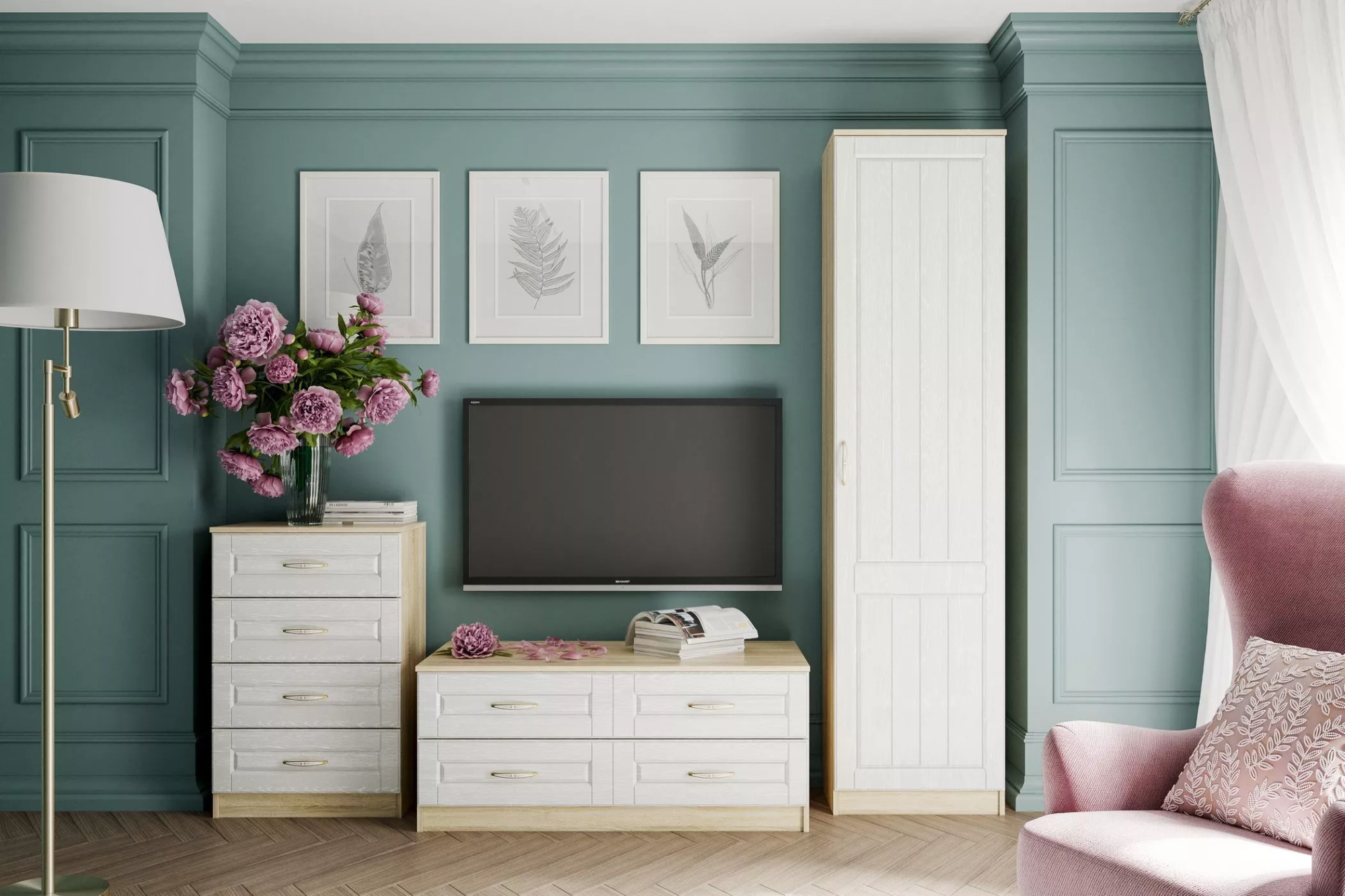 Коллекция ОЛИВИЯ – это воплощение легкости и нежности. Древесные текстуры светлых оттенков, элегантные ручки и высокое качество материалов, все это делает данную комплектацию отличным выбором для Вашей гостиной. В комплектации №5 есть комод, тумба под TV и шкаф для одежды, которые не перегружают пространство, но при этом обеспечивают необходимый функционал: места для хранения документов, декора и даже одежды.