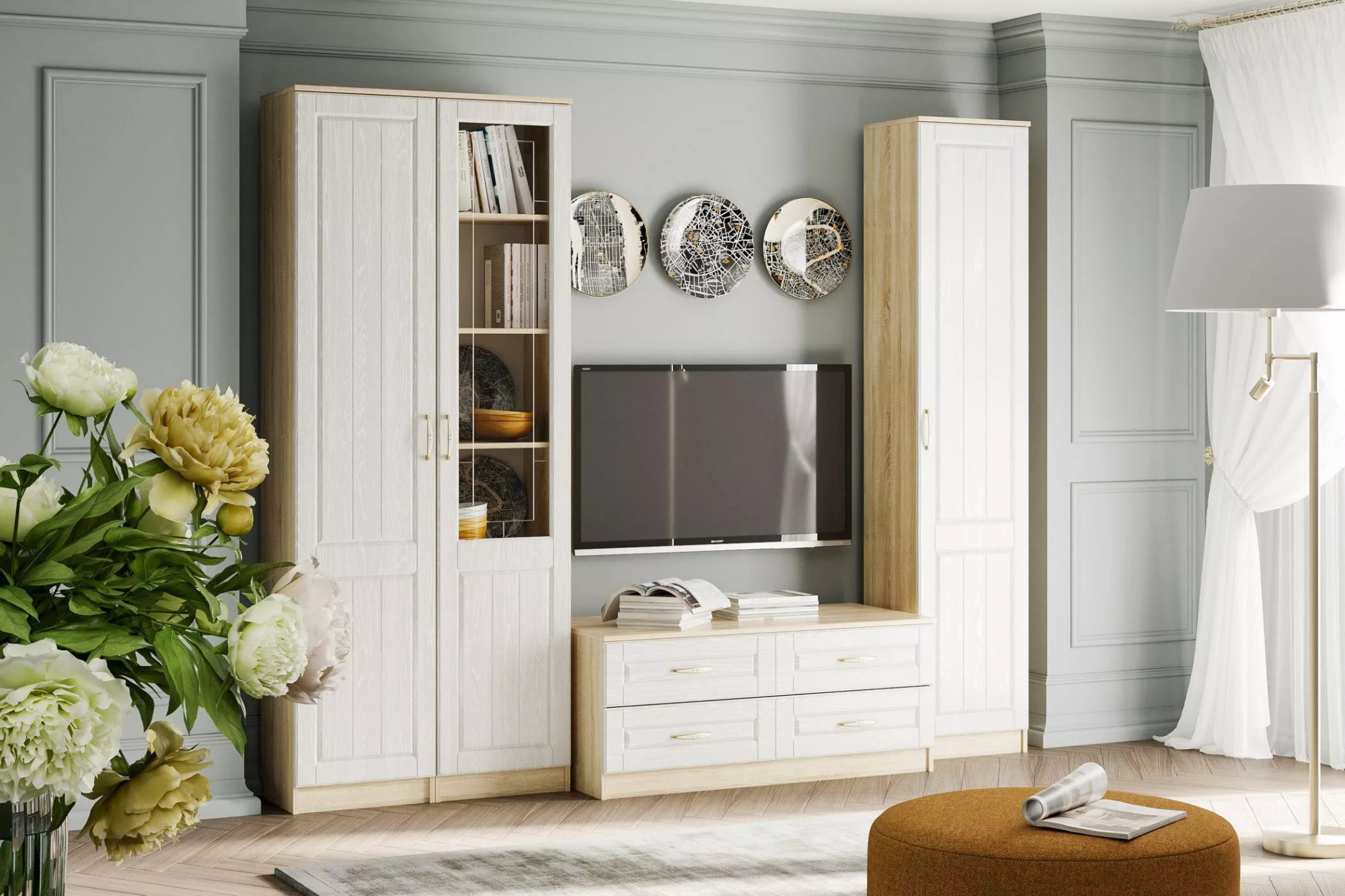 Коллекция ОЛИВИЯ – это воплощение легкости и нежности. Древесные текстуры светлых оттенков, элегантные ручки и высокое качество материалов, все это делает данную комплектацию отличным выбором для Вашей гостиной. Комплектация №6 несет в себе декоративную составляющую за счет витрины, за которой можно разместить книги, сувениры или предметы интерьера, а также функциональную составляющую благодаря шкафу и тумбе с ящиками для хранения.