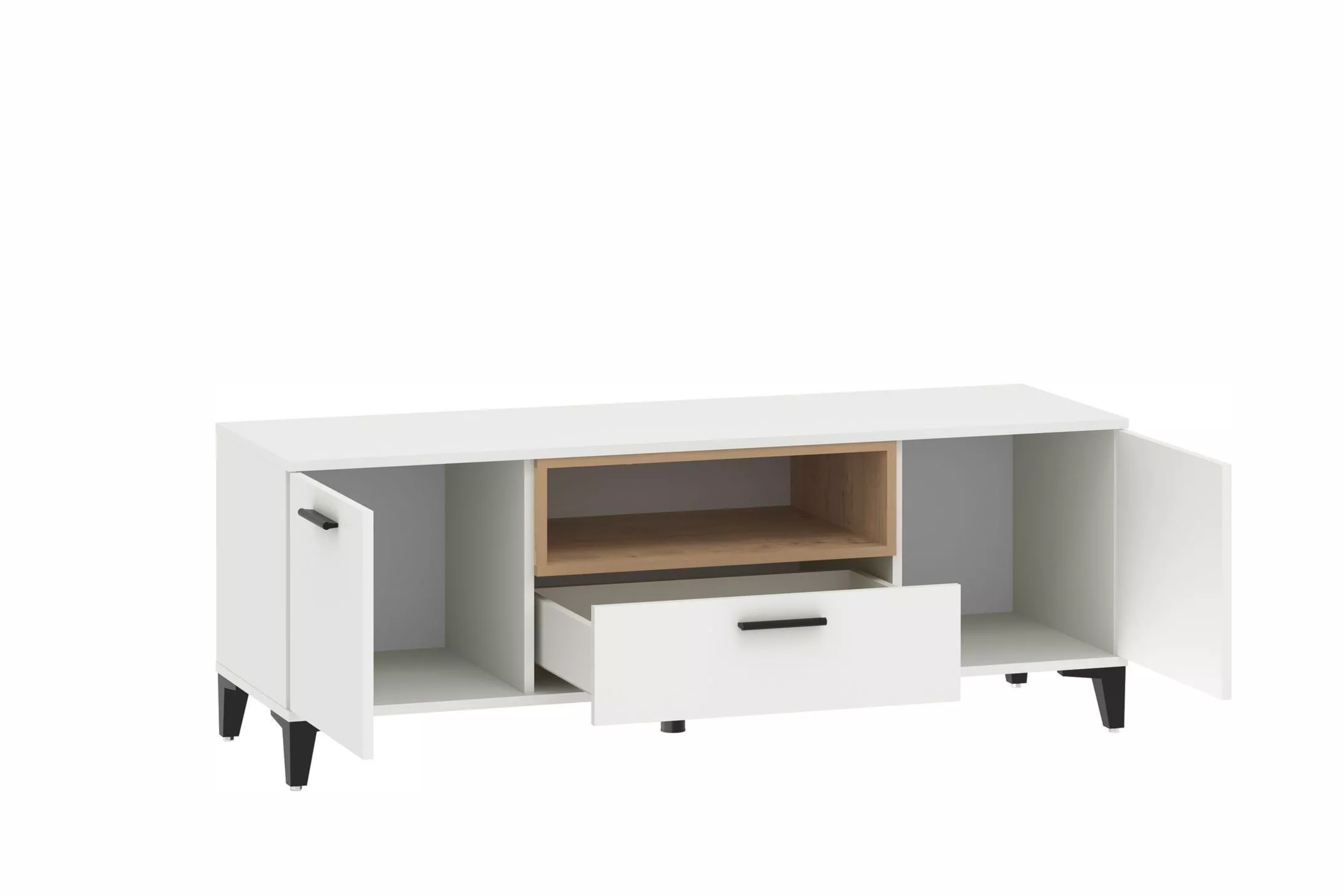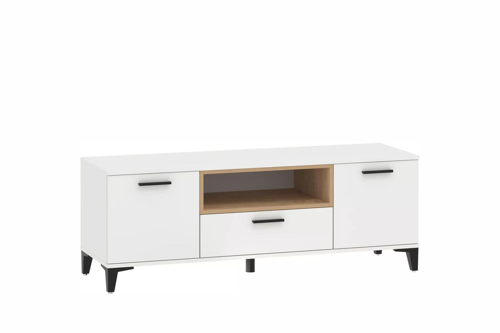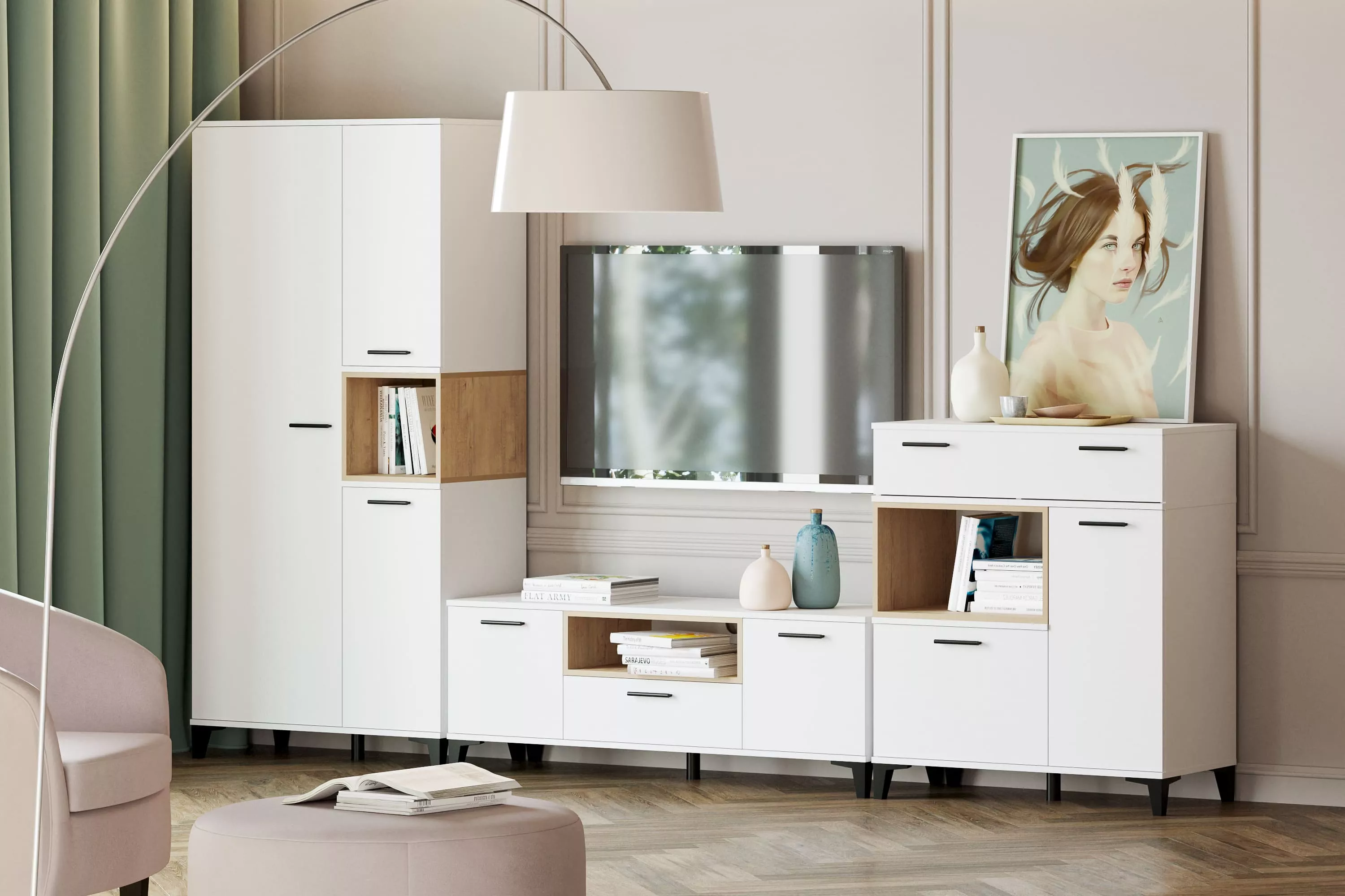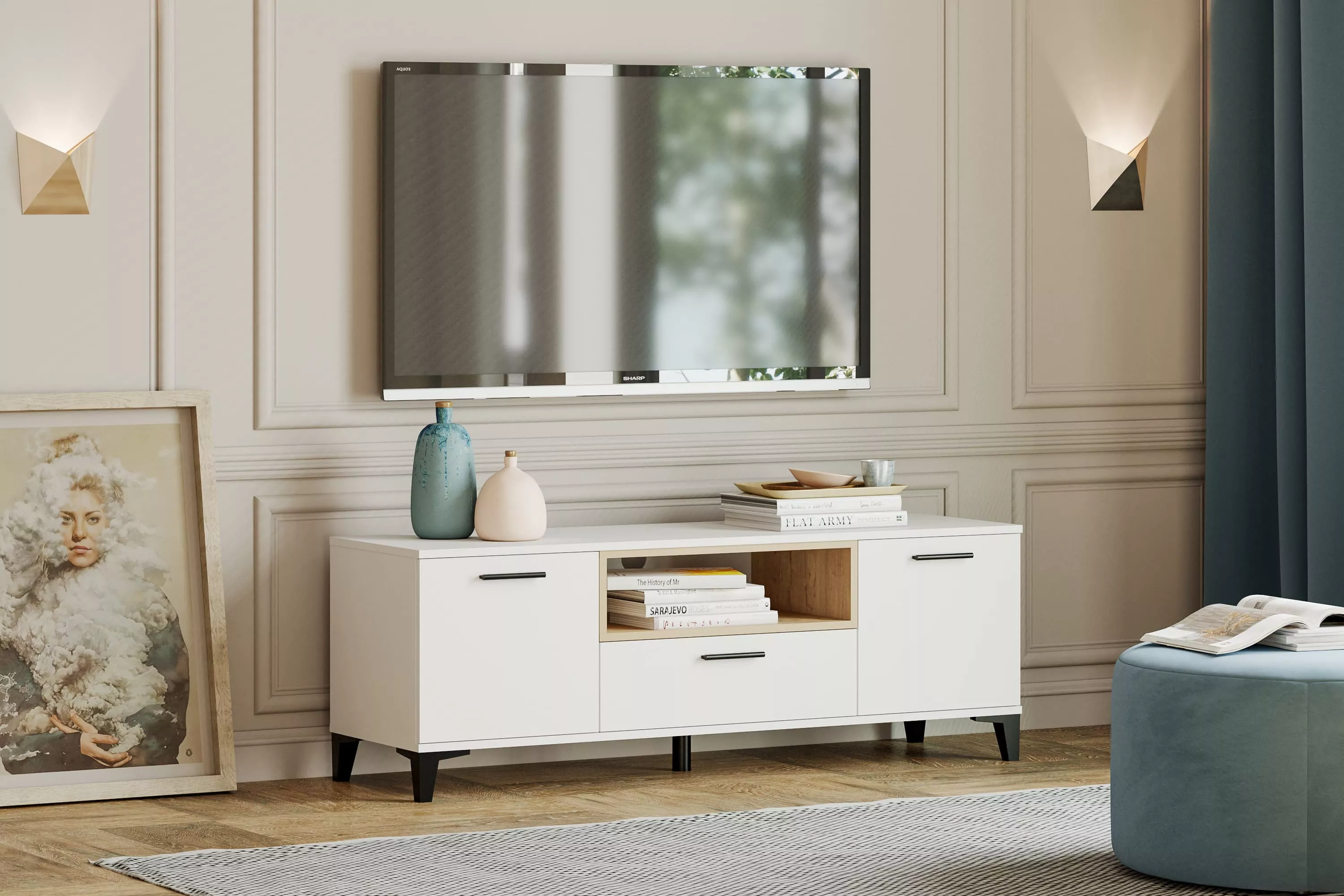 Тумба под телевизор «Берген» сочетает в себе функциональность, стиль и компактные размеры. Продуманная конструкция и лаконичные геометрические формы, дополненные нейтральными цветами и яркими акцентами в виде контрастных деревянных вставок и черных ручек, гармонично впишутся как в светлые, так и в темные интерьеры.Тумба «Берген» предлагает разнообразные решения для хранения: полки за распашными дверцами, ящик с плавным и бесшумным выдвижением благодаря шариковым направляющим, а также открытую нишу для книг и декоративных элементов. Высокие опоры придают конструкции визуальную легкость и обеспечивают удобство при уборке.