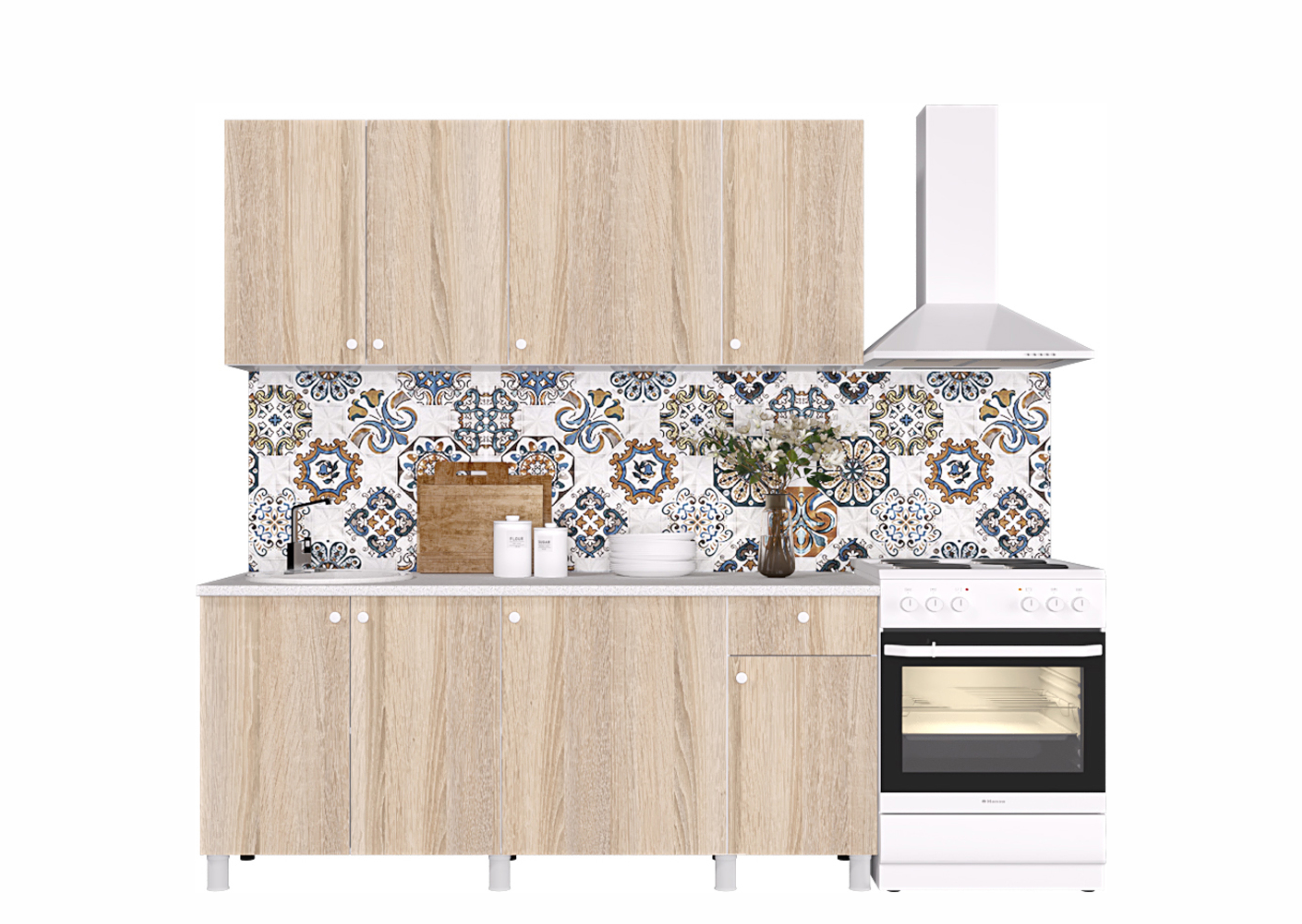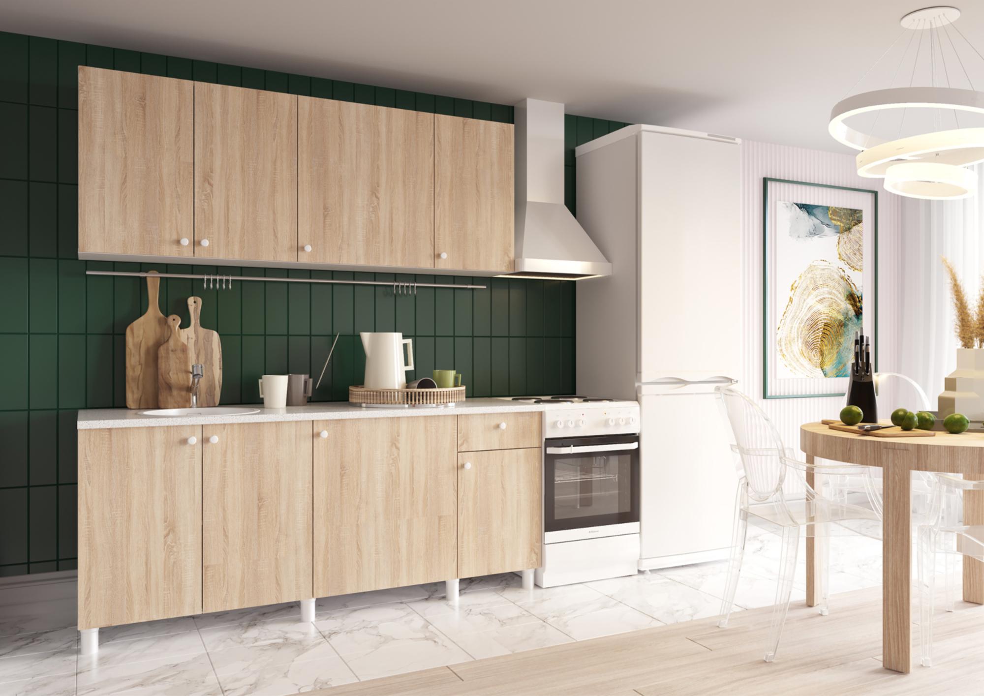 Эта кухня сочетает в себе надежность и удобство использования. Корпус и фасады изготовлены из качественного ЛДСП с кромкой ПВХ толщиной 0,4 мм, что обеспечивает долговечность и привлекательный внешний вид. Регулируемые опоры позволяют адаптировать кухню под любые условия. Продуманная конструкция включает распашные фасады и ящики с роликовыми направляющими Boyard.Габариты: