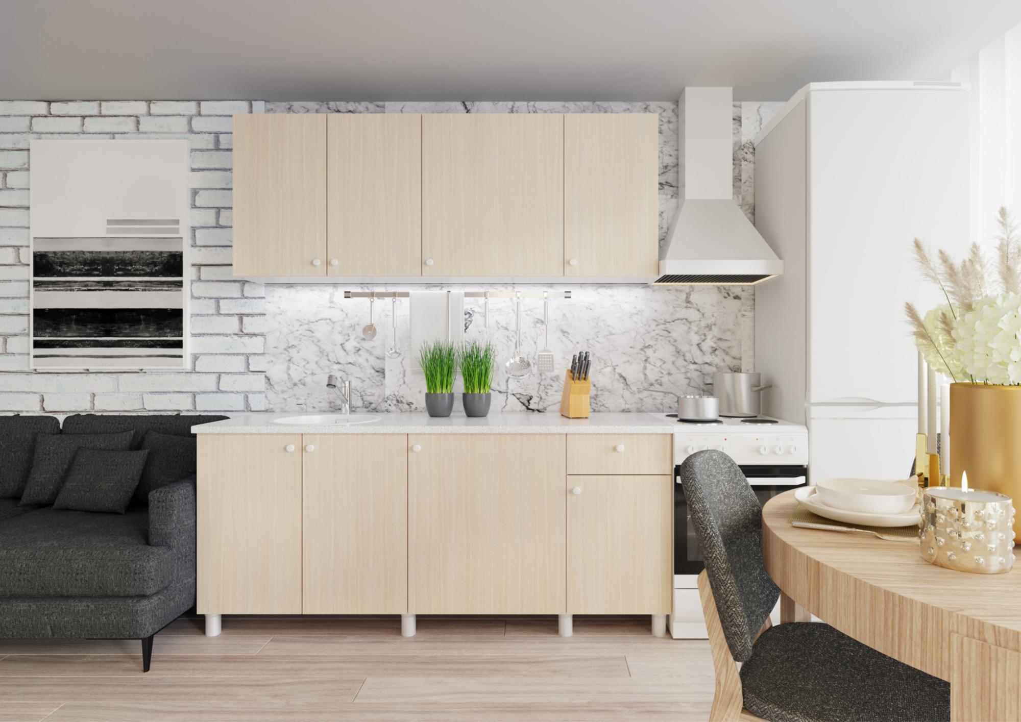 Эта кухня сочетает в себе надежность и удобство использования. Корпус и фасады изготовлены из качественного ЛДСП с кромкой ПВХ толщиной 0,4 мм, что обеспечивает долговечность и привлекательный внешний вид. Регулируемые опоры позволяют адаптировать кухню под любые условия. Продуманная конструкция включает распашные фасады и ящики с роликовыми направляющими Boyard.Габариты: