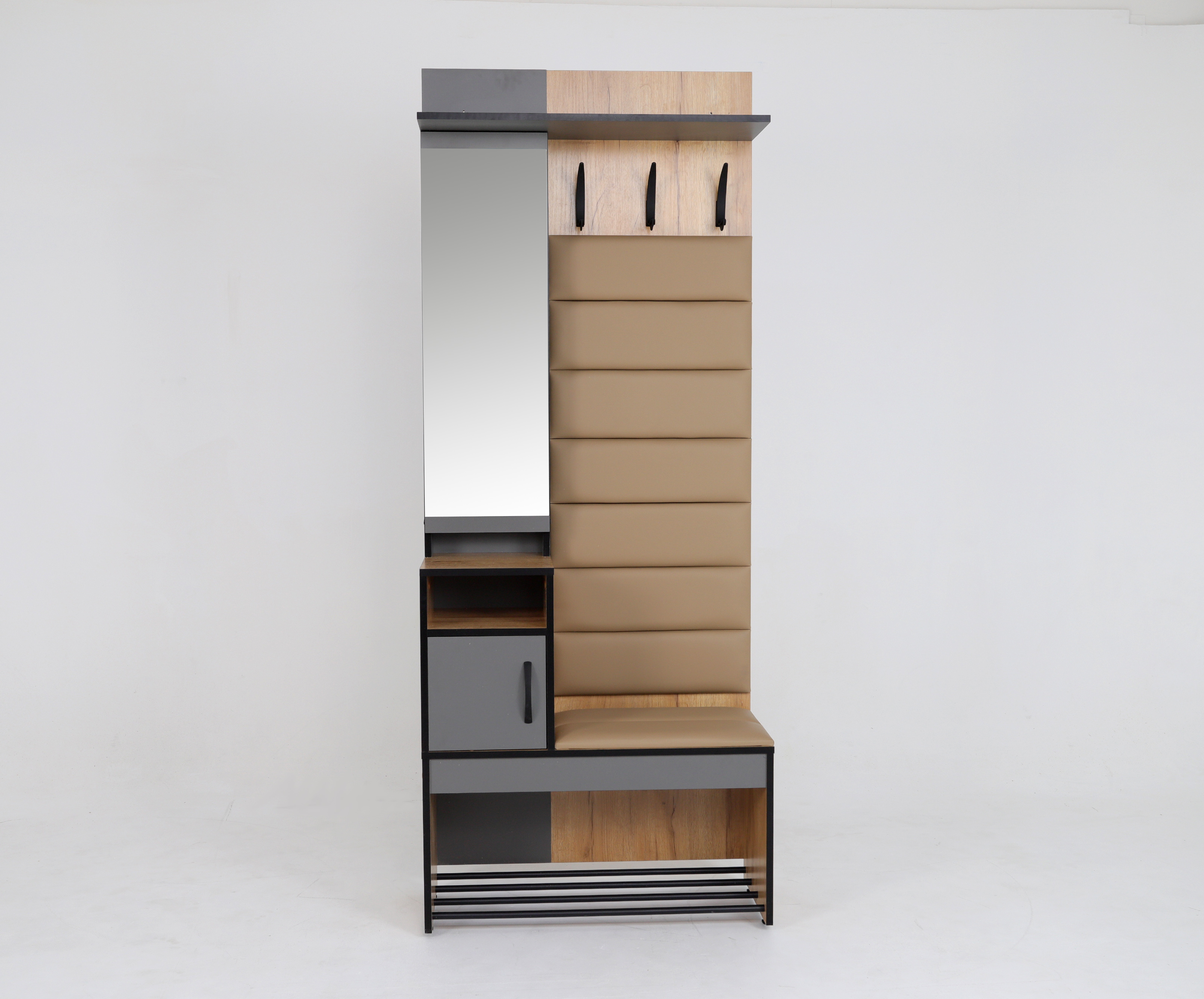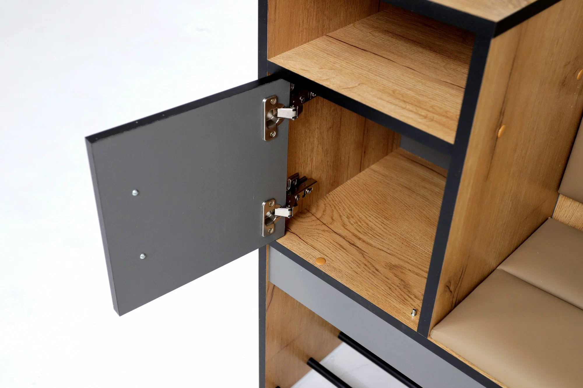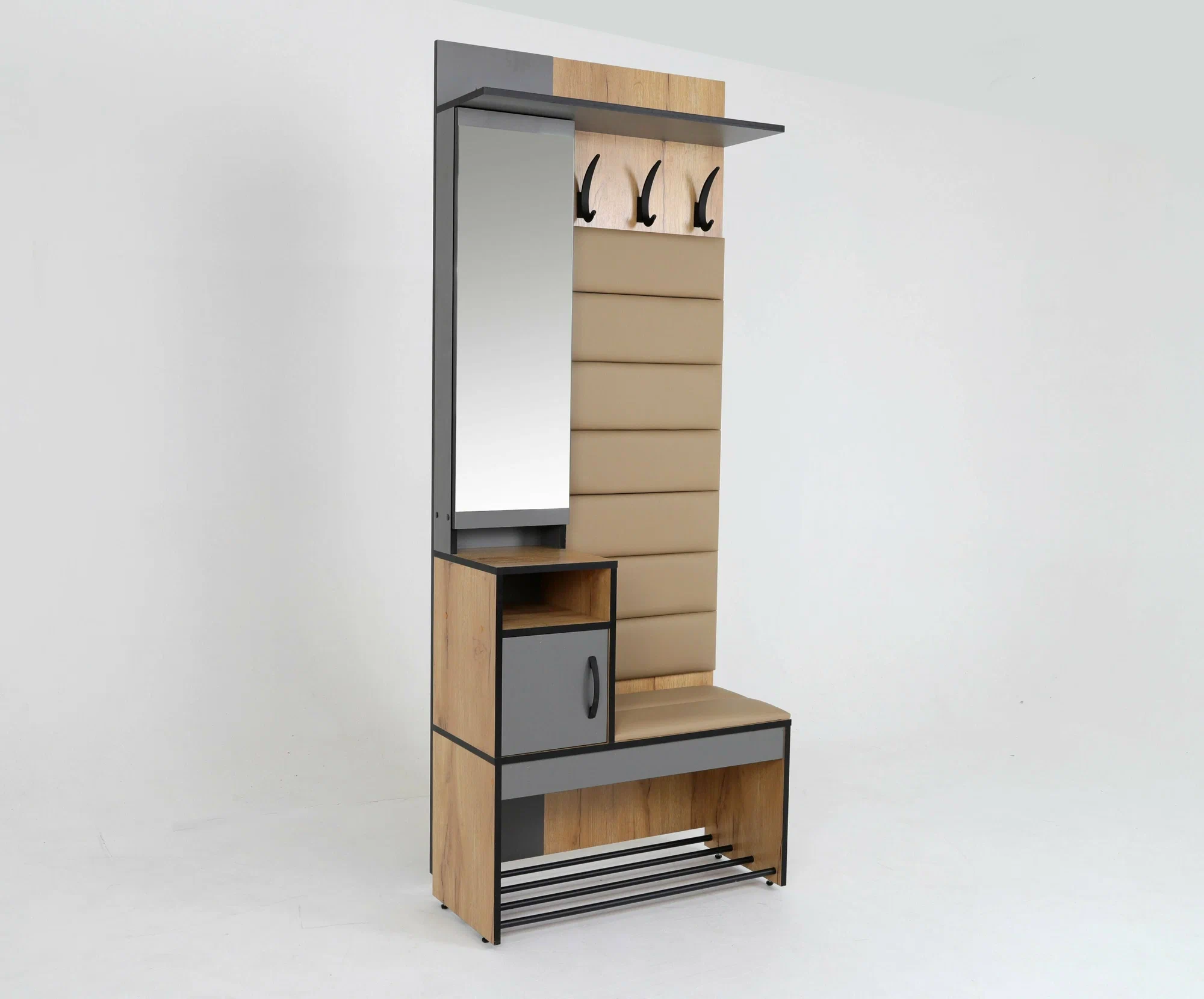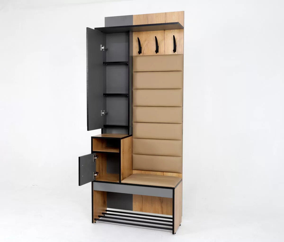 Функциональная прихожая «Ольга — Лофт»! Тёплый оттенок «Дуб Крафт Золотой» гармонично сочетается с брутальными серыми фасадами и чёрной кромкой. Фурнитура и мягкий элемент завершают образ прихожей. Особенности модели: дверца с доводчиком, пластиковая фурнитура, зеркало с фацетом, мягкий элемент из экокожи (Люкс Бренди), полка для обуви и регулируемые опоры.Габариты: