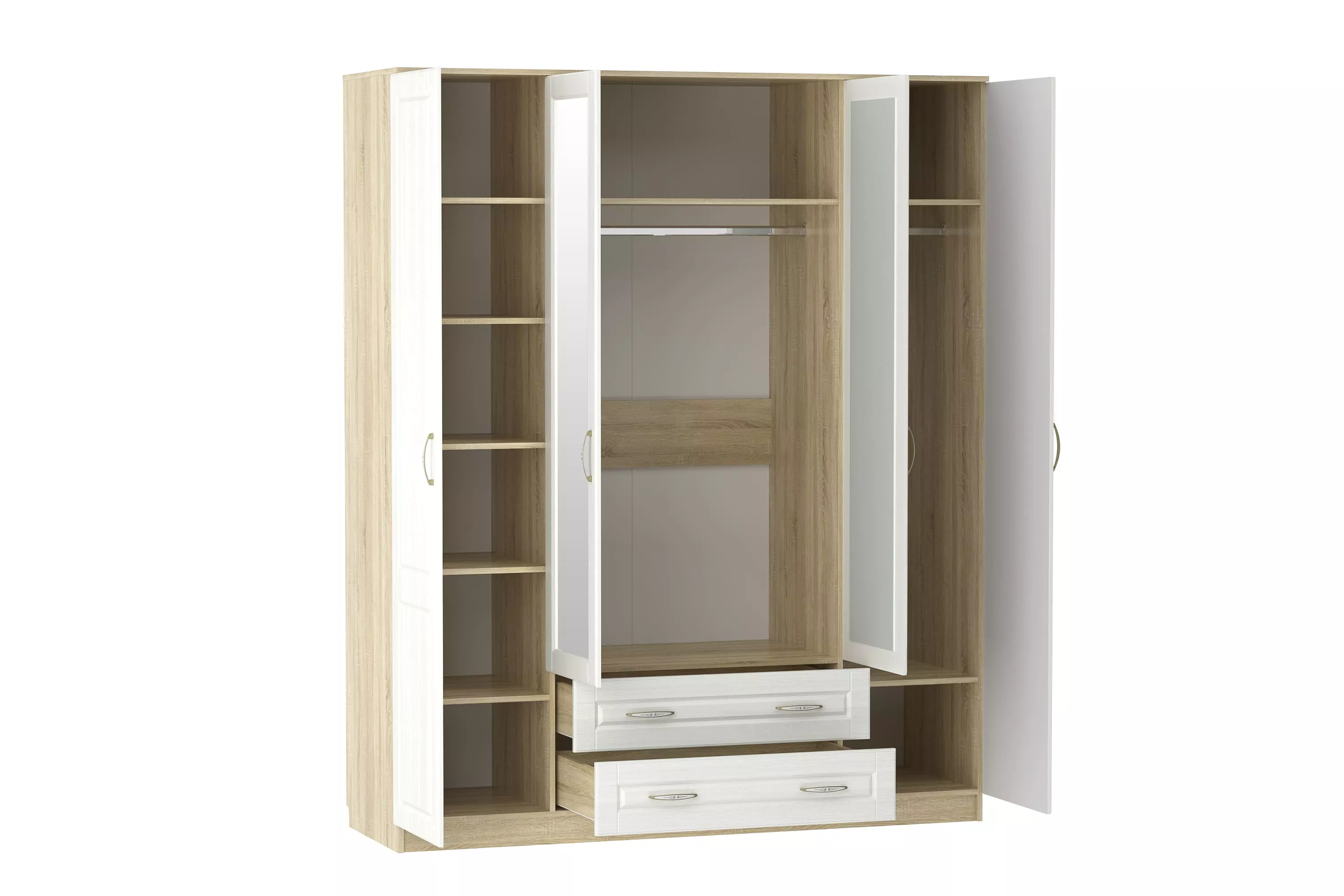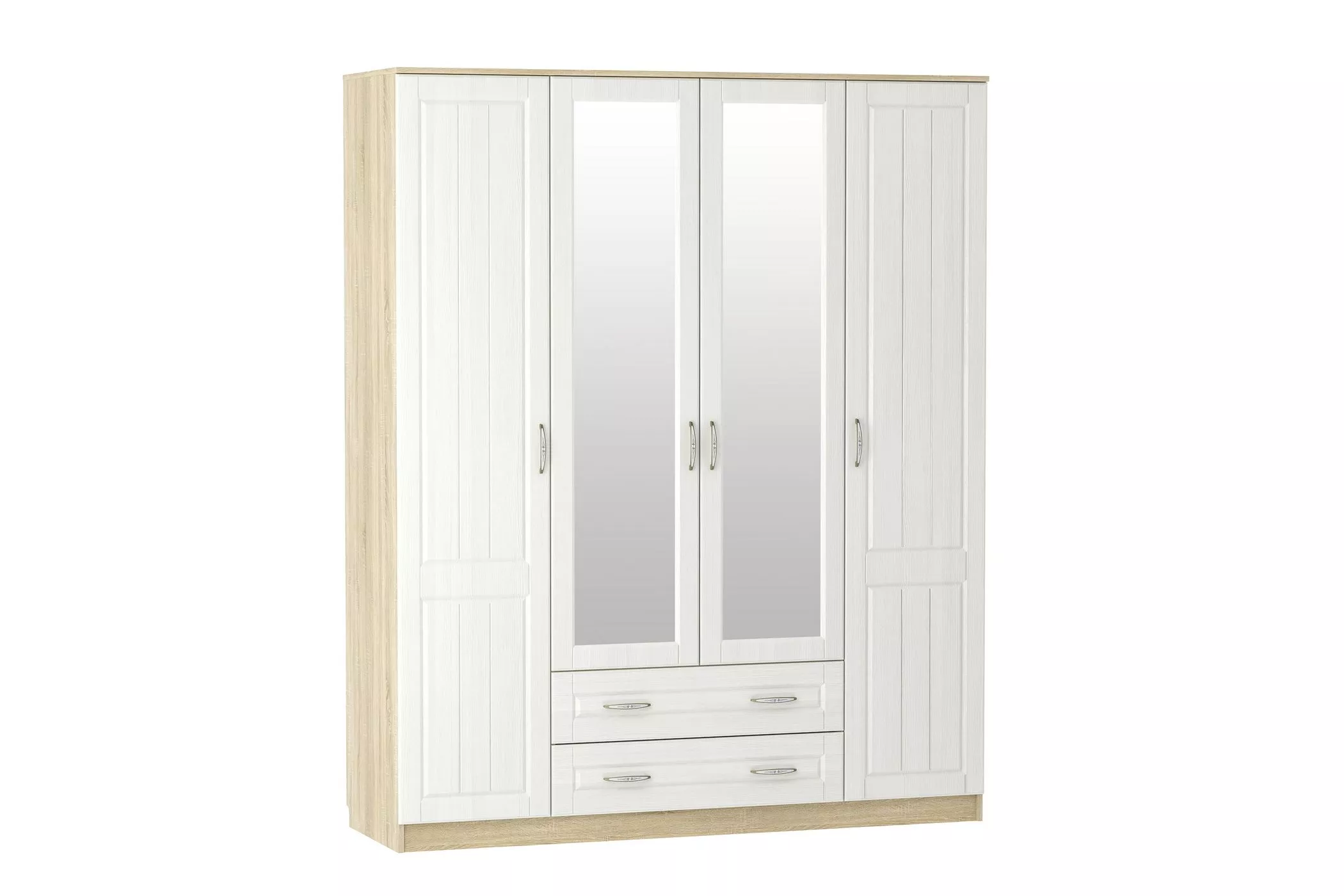 Комплектация №1 отлично подходит для просторной спальни. Для каждой вещи найдется свое место благодаря наличию в наборе вместительного четырехстворчатого шкафа, который поможет разгрузить гостиную и прихожую. Кровать оборудована двумя ящиками для хранения постельного белья. Все необходимые вещи будут под рукой в ящиках прикроватной тумбы. Завершает композицию зеркало с туалетным столиком, в котором удобно хранить косметику или украшения.