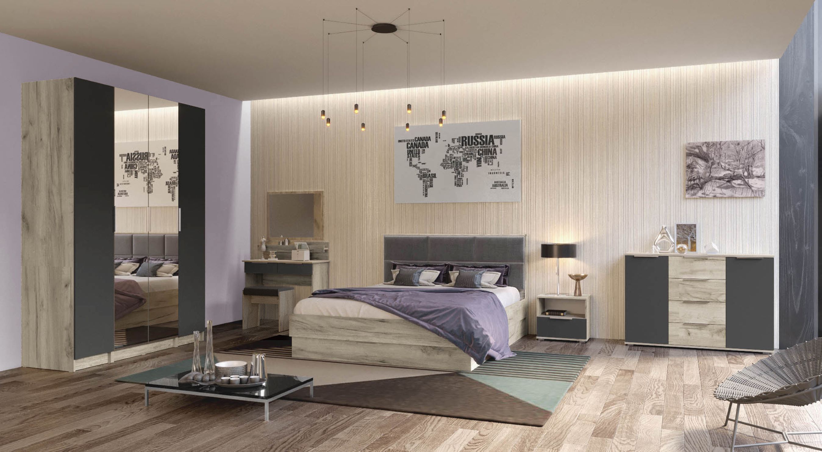 Спальный гарнитур "Венеция" изготовлен в ультра модной цветовой гамме Дуб Серый Крафт и Серый Графит. Этот спальный гарнитур будем жемчужиной вашей спальни и будет вас радовать еще множество лет.Цвет корпуса/фасада