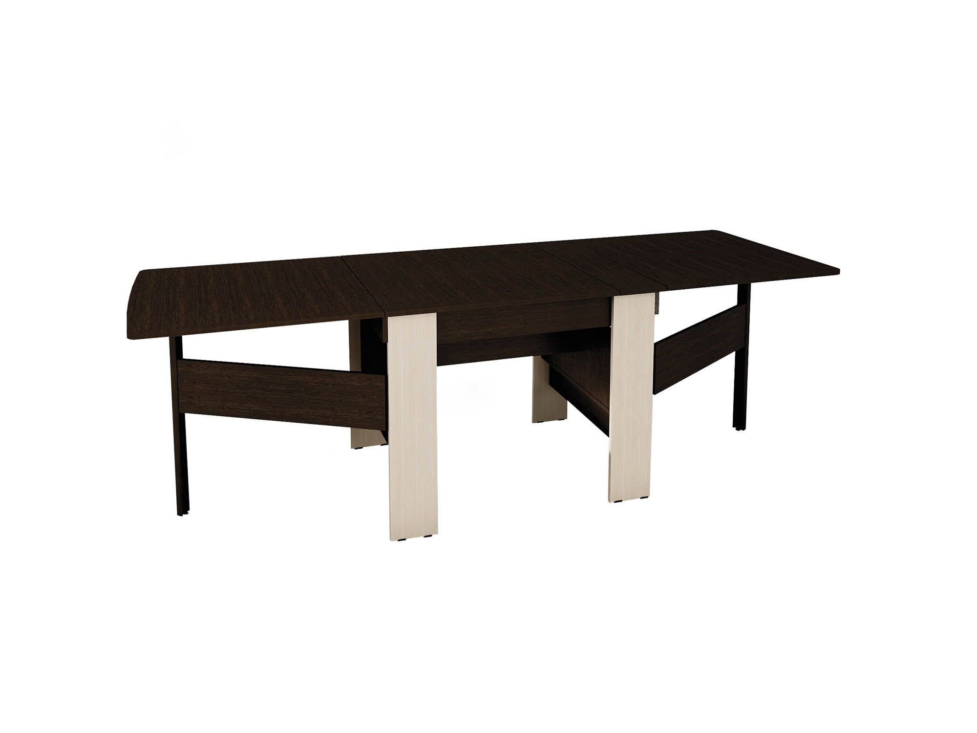 «Колибри 12.2 Венге-Кобург» – отличный стол-книжка для больших компаний. За считанные минуты стол превращается из узкой тумбы в большой обеденный стол длиной 2,31 м, за которым можно уместить до 12-ти человек. Темный древесный оттенок с контрастным сочетанием молочного цвета выглядит роскошно и благородно, придает интерьеру черты респектабельности. Лаконичный дизайн стола подчеркивает его функциональность и делает его универсальным решением для разных стилей.За одну цену Вы приобретаете 4 стола: