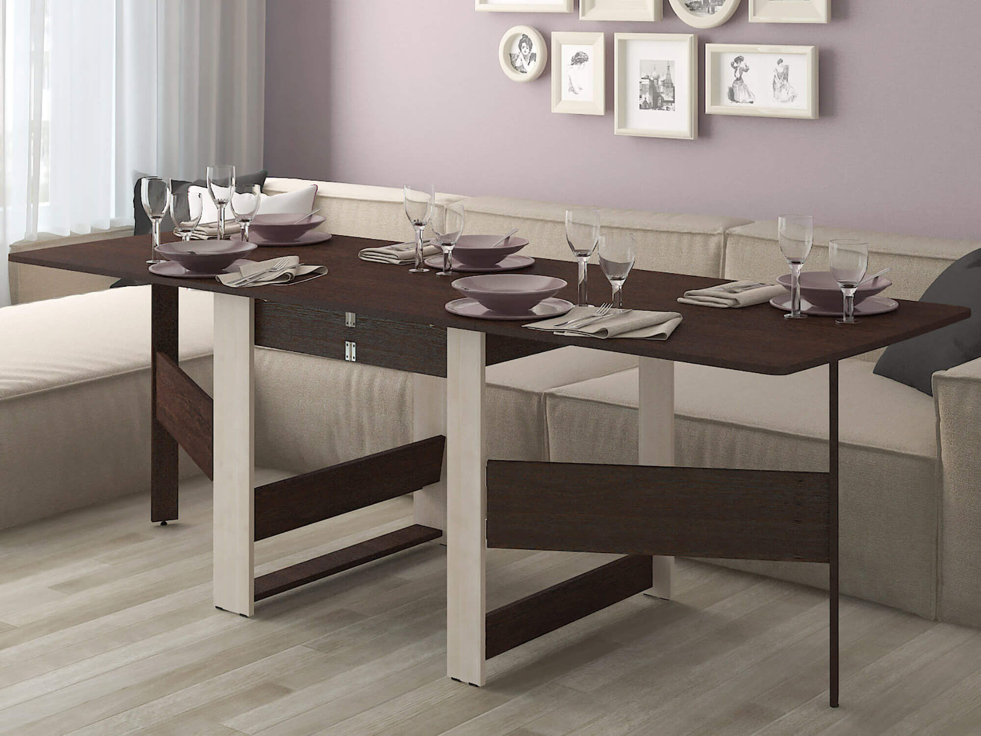 - стол с одной разложенной столешницей/с использованием внутренних вставок может использоваться как небольшой обеденный стол или в качестве письменного стола в рабочей зоне;